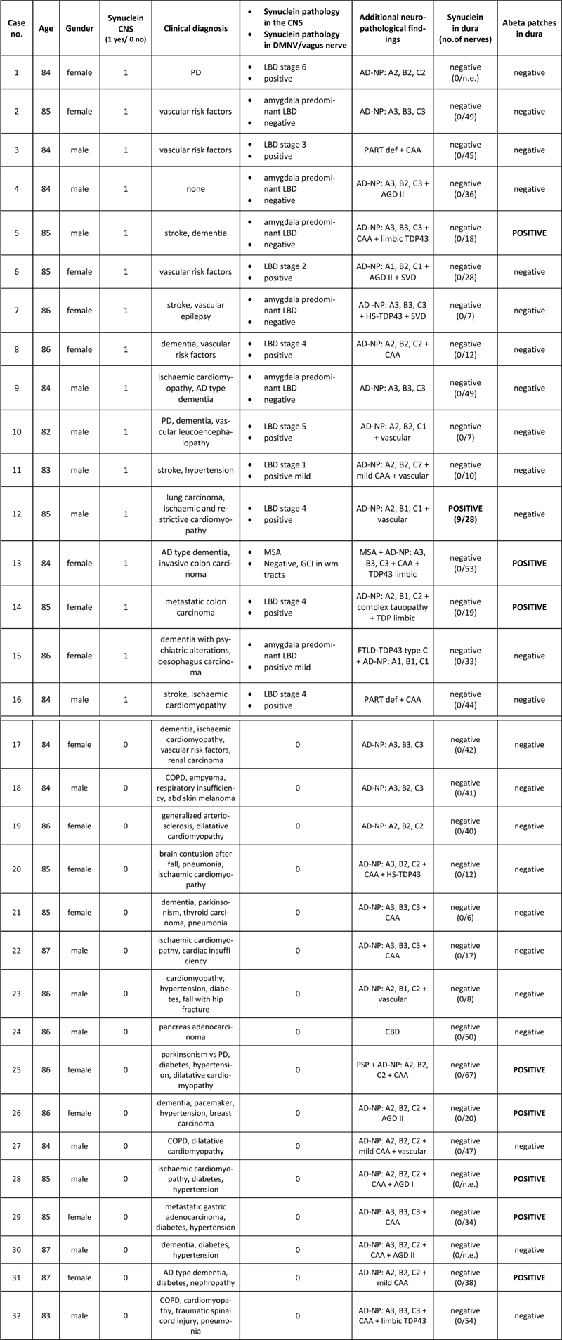 Abstract Deposition of alpha-synuclein in the brain is a hallmark of Lewy body disorders. Alpha-synuclein has been considered to show prion-like properties. Prion diseases can be transmitted by the transplantation of cadaveric dura mater causing iatrogenic Creutzfeldt-Jakob disease. Recent observations of amyloid-β deposition in dural grafts support the seeding properties of amyloid-β. Here we assessed the presence of alpha-synuclein in dura mater samples as a potential transmissible seed source. We immunostained 32 postmortem dura mater samples; 16 cases with Lewy-body disorder (LBD) showing different pathology stages and 16 non-LBD cases for phosphorylated (Ser129) and disease-associated (5G4) alpha-synuclein. Disease-associated alpha-synuclein aggregates were identified in intradural nerve fibres and associated with a vessel in a single LBD-Braak stage 4 case. We conclude that alpha-synuclein is detectable, although rarely, in dura mater samples in patients with LBD. The risk of potential transmissibility of dural alpha-synuclein deserves assessment by complementary experimental studies. Introduction Neurodegenerative diseases are considered protein-misfolding disorders. As described in prion diseases, the host physiological protein adopts an abnormal conformation (seed), capable of inducing misfolding and aggregation of the neighboring molecules (e.g. for prion protein: the physiological PrPC converting to disease-associated PrPSc, and PrPSc recruiting more PrPC). In prion disease, strong clinical, epidemiological and experimental evidence has demonstrated human and interspecies transmissibility of PrPSc(1). For several other proteins associated with neurodegenerative conditions, such as Amyloid-β (Aβ), Tau, alpha-synuclein, and TAR DNA binding protein (TDP-43), properties similar to those of PrP have been shown predominantly in an experimental setting (2). The potential of Aβ peptides to be transmitted between humans has been a topic of great interest for public health. Young adults with iatrogenic Creutzfeldt-Jakob-Disease (CJD) following cadaveric pituitary-derived growth hormone in childhood were found to have Aβ deposits in the brain parenchyma and blood vessels (3, 5, 6), as well as in iatrogenic CJD after dura grafting (4). Two studies have reported the presence of Aβ deposits in dura mater samples of postmortem brains of patients with Alzheimer’s disease (AD) and other neurodegenerative pathologies (7, 8). Additionally, neurosurgical procedures and dural grafting during childhood or teenage years have been related to increased cerebral amyloid angiopathy (CAA) decades later (9, 10). These findings indicate that dura mater grafts could be also a source of Aβ seeds capable of inducing the aggregation of Aβ in the CNS of the graft recipients. Lewy-body disorders (LBD) and multiple system atrophy (MSA) are characterized by the accumulation of alpha-synuclein. A growing body of experimental evidence supports prion-like propagation in alpha-synucleinopathies (11-13). Observations in a small number of subjects with Parkinson`s disease (PD) treated with fetal mesencephalic dopaminergic grafts in the striatum, who years later were found to have alpha-synuclein positive LBs in grafted neurons, first suggested the potential of alpha-synuclein propagation from host to graft cells (14, 15). While experimental studies have also successfully demonstrated the transmission potential of MSA alpha-synuclein in genetically modified mouse models (16), observations in humans argue against a human-to-human iatrogenic transmission of MSA and PD (17). Given the potential implications for public health, we posit that thorough assessment of the potential transmissibility of all neurodegenerative proteinopathies is essential (18). Therefore, in this study, we assessed human postmortem dura mater samples, some of which have been previously shown to harbor Aβ deposits (7), for the presence of alpha-synuclein aggregates, which may represent seeds with the potential of propagating further synucleinopathy. Material and methods Formalin-fixed and paraffin-embedded postmortem tissue samples of the dura mater from the left temporal and posterior region as well as cross-sections from the area of the superior sagittal sinus and confluence of sinuses (7), were cut into 5-micrometer thick sections. This study was approved by the Ethics Committee of the Medical University of Vienna. Brains were previously evaluated neuropathologically and a final primary diagnosis and concomitant pathologies were recorded. Fixation time of dura mater samples ranged from 3 to 10 years. Immunohistochemistry of the dura mater samples was performed on an automated immunostainer (DAKO Autostainer Link 48, Glostrup, Denmark) using two different anti-alpha-synuclein antibodies: clone 5G4 (1:4000), Roboscreen, Leipzig, Germany; specific for disease-associated forms and the phospho-specific anti-alpha-synuclein phosphorylated at serine 129 (Wako) (1:2000). In addition, we performed immunohistochemical staining to depict the nerve fibres within the connective tissue of the dura mater: anti-neurofilament protein (NFP), clone 2F11 (1:800), DAKO; PGP 9.5 (1:100), DAKO, rabbit polyclonal; anti-tyrosine hydroxylase, clone 1B5 (1:200), Novocastra, Newcastle, UK; and anti-phosphorylated neurofilaments, clone SMI31 (1:5000), former Covance Research Products, Princeton, NJ, USA, and for blood and lymphatic vascular endothelia (anti-CD34, clone QBEnd/10 (1:100), Novocastra; and podoplanin (1:3000), rabbit polyclonal). DAKO Flex system (peroxidase/DAB) was used for visualization of antibody reactions. Samples were assessed blind to the neuropathological diagnosis. The presence or absence of each specific immunoreactivity was recorded. In addition, double immunofluorescence combining PGP 9.5 and 5G4 antibodies and immunofluorescence staining with NFP and 5G4 on adjacent tissue sections was performed in one selected case. Results We analyzed p