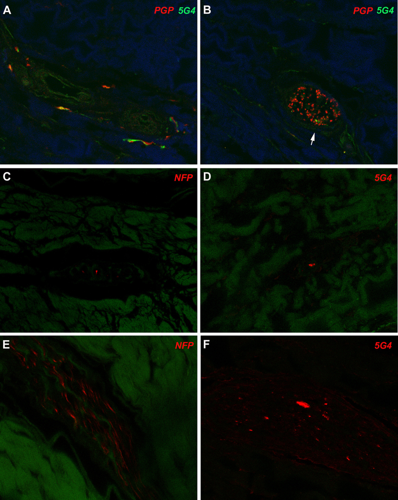 Figure 2: Immunofluorescence images A, B: Double immunofluorescence for PGP 9.5 depicts delicate perivascular fibres (red) which focally also accumulate alpha-synuclein (5G4, green). Other regions show nerve fascicles with variable density of axonal profiles: some have abundant axons (B, PGP 9.5, red) and show only tiny alpha-synuclein accumulations (5G4, green, white arrow). C-F: In adjacent tissue sections some nerve fascicles have only few axons (C, NFP) while others show an intermediate density of axons (E, NFP red) with relatively abundant and coarse alpha-synuclein aggregates (F, 5G4). Discussion In this study, we found alpha-synuclein aggregates in dura mater samples from one patient with Lewy-body pathology (Braak stage 4) (20). Alpha-synuclein aggregates were not identified in the dura mater of 31 other cases with different stages of LBD or in other neurodegenerative conditions. These findings might have implications for public health as well as for the understanding of alpha-synuclein propagation. Concerning public health, individuals with symptomatic or prodromal alpha-synucleinopathies may undergo neurosurgical interventions contacting the dura mater (for example, the widespread use of deep brain stimulation in PD). While there is still no epidemiological evidence of human-to-human transmission of alpha-synuclein (17), the application of appropriate prevention measures will be increasingly required if experimental studies strengthen evidence of the potential transmissibility of synucleinopathies. This further emphasizes the need for effective biomarkers for the early diagnosis of alpha-synuclein related diseases (21-24). Furthermore, there is a clear need for the detailed mapping of tissues that may harbor potential seeds. Indeed, with respect to the present findings, since dura mater transplants are in direct contact with brain tissues, they might provide an increased potential to propagate seeds to the recipient’s CNS. Concerning protein propagation, the dura mater has been a source of disease transmission in human prion disease (1) and is also a source for Aβ seeds (9, 10). Recent studies support the notion that these seeds are able to propagate pathological proteins, even without inducing the classical Alzheimer´s phenotype. However, they can lead to unexpectedly increased frequency of cerebral amyloid angiopathy and associated brain hemorrhages (9, 10). Propagation of human alpha-synuclein has been considered since the detection of alpha-synuclein aggregates in grafted fetal mesencephalic neurons in PD patients (14, 15). This has subsequently been demonstrated in experimental studies (13) including inoculation of human substantia nigra extracts containing Lewy bodies into wild-type mice and macaque monkeys (26). In contrast, the inoculation of extracts of peripheral alpha-synuclein from the autonomic sympathetic stellate ganglion did not induce pathological conversion of endogenous alpha-synuclein, alpha-synuclein propagation, or neurodegeneration in mice (27). Thus, central and peripheral nervous system-related alpha-synuclein might have different propagation potential and therefore different transmissibility. The dura mater is thoroughly innervated by afferent fibres arising from the ipsilateral trigeminal ganglion and nerve (including its ophthalmic, maxillary and mandibular divisions) and by sympathetic fibres arising from the ipsilateral superior cervical ganglion. The posterior cranial fossa dura mater receives sensory meningeal branches from the vagus and glossopharyngeal nerves. The sympathetic ganglion is upstream from the stellate ganglion, which has been shown to harbor prominent alpha-synuclein or Lewy-type pathology in postmortem studies of patients with PD and dementia with Lewy bodies (23, 24), along with the dorsal motor nucleus of the vagal nerve in the CNS (20). Therefore, it might be reasonable to consider that these sympathetic and parasympathetic fibres innervating the dura mater might also accumulate alpha-synuclein. Although in that particular case where we found alpha-synuclein in the dura mater, we did not have the opportunity to stain the trigeminal ganglion or nerve nor the stellate ganglion, we have previously evaluated the trigeminus nerve using immunostaining for alpha-synuclein. In that study we found alpha-synuclein immunoreactivity in two out of four PD/LBD cases where a total of six trigeminal nerves (in two cases both sides available) were examined (28). Alternatively, we have previously reported that the presence of lymphatic vessels in dura mater might be a drainage route for molecules from the brain parenchyma in neurodegenerative disorders, including alpha-synuclein in LBD (25). Although we found discrete perivascular alpha-synuclein aggregates in dura mater samples, we were not able to confirm whether these represent lymphatic vessels, possibly due to the prolonged fixation time of this dura mater sample (<6 years), and therefore this question deserves further study. The present study has some limitations. First, as mentioned above, the dura mater samples were obtained after a prolonged fixation time, which may influence immunohistochemical results, not only for CD34, podoplanin and TH, but for phospho-synuclein as well (29). Therefore, the interpretation concerning the perivascular association of alpha-synuclein aggregates needs some caution. We could also not reliably assess axonal preservation in the case harboring alpha-synuclein aggregates. The prolonged fixation also does not allow complementary molecular/biochemical studies. While the identification of characteristic pathological aggregates of alpha-synuclein with only one antibody is limiting, the 5G4 antibody has shown to be a robust marker of early alpha-synuclein pathology, even in brains with prolonged fixation time (30). Second, the level of pathological forms of alpha-synuclein detectable by conventional immunohistochemistry may be low. Moreover, the analysis of t