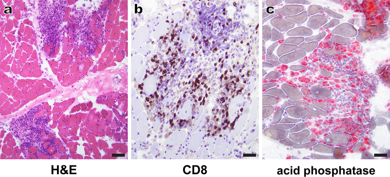 Figure 2. Myositis secondary to therapy with immune checkpoint inhibitors (irMyositis): A representative H&E-stained cryosection (a) shows patches of dense perimysial inflammation that focally extend into the endomysium and abut clusters of degenerating/regenerating muscle fibers; away from the inflammatory foci, muscle fibers have a relatively normal appearance. Immunohistochemistry for CD8 (b) and histochemistry for acid phosphatase (c) show that the inflammatory infiltrate largely consists of cytotoxic T cells and macrophages, respectively. The patient was treated with pembrolizumab and presented with evidence of myocarditis as well as limb and bulbar weakness approximately 6 weeks following the last antibody dose. Scale bars: a, 100 µm; b-c, 50 µm. In recent years, stem cell treatments have also risen in popularity, although they have no documented health benefits and are – at least for now – completely unregulated. In 2019, it was recognized that one relatively common form of stem cell treatment, intrathecal injection of allogeneic stem cells, can lead to development of distinctive lesions of the lumbosacral spinal cord and spinal cord nerve roots. These lesions, named neuroglial stem cell-derived inflammatory pseudotumors [n-SCIPTs; (Sloan et al., 2019)], can clinically mimic inflammatory and neoplastic disease processes and usually consist of a haphazardly organized neuroglial tissue that resembles a low-grade neuroglial tumor (Fig. 3); typically, there is at least focal inflammatory infiltrate, which likely represents a host immune response to foreign antigens. While it seems likely that direct injection of allogeneic stem cells into other parts of the body could lead to development of stem-cell derived pseudotumors with non-neuroglial differentiation, only neuroglial SCIPTs have been reported to date (Sloan et al., 2019). From a diagnostic perspective, it is critical to be aware of the n-SCIPT existence, so that these lesions (which at the moment seem to be best handled through watchful waiting) are distinguished from the spinal cord tumors that would generally warrant a more aggressive treatment. Advances in understanding of etiology and pathogenesis of neuromuscular diseases 3. Acute flaccid myelitis: Mounting evidence for causation by non-polio enteroviruses Acute flaccid myelitis (AFM) is a clinical syndrome characterized by flaccid limb weakness that develops acutely and has a lower motor neuron pattern; the current diagnostic criteria also include spinal cord imaging findings suggestive of anterior myelitis (Messacar et al., 2018). The most common form of AFM used to be poliomyelitis, which is caused by poliovirus [a member of the En terovirus (EV) genus]; as a result, AFM became rare worldwide after introduction of the anti-polio vaccine in the 1950s. A small number of AFM cases in the period from 1970-90 was attributed to infection with EV-A71 and a few other viruses (Dyda et al., 2018; Messacar et al., 2018). Since 2012, however, AFM has started to increase in incidence. The current form of this disease, first documented in California, is characterized by limb paralysis that occurs 5-7 days after a flu-like respiratory illness; it primarily affects young children (3-9 years of age) and peaks in incidence every other year during the summer/fall season. The largest number of confirmed cases (>500 to date) has been reported in the US, with sporadic cases confirmed throughout the world (Schubert et al., 2019). In 2014, the peak of AFM incidence has shown a temporal and geographic overlap with the outbreak of EV-D68 infection, raising the possibility that EV-D68 (which rarely caused human disease prior to 2008) might be the cause of recent AFM outbreaks (Dyda et al., 2018). Indeed, EV-D68 infection meets many of the Bradford-Hill criteria (nine principles applied to examine causality) that are required to establish it as a cause of AFM (Dyda et al., 2018; Messacar et al., 2018). In particular, AFM-like disease can be recapitulated in a mouse model through infection with a 2014 strain (but not the originally isolated 1962 strain) of EV-D68, suggesting that neurotropism might have emerged only recently in EV-D68 evolution (Hixon et al., 2017). However, 2016 AFM cases have not shown a clear association with an EV-D68 outbreak, raising doubts about the causal association between EV-D68 and AFM (Dyda et al., 2018). Moreover, EV has not been detected in the respiratory or GI specimens from more than half of AFM children, and EV RNA is very rarely detected in the CSF of AFM patients (Schubert et al., 2019); thus, concerns have persisted that recent AFM outbreaks might be caused by a still unidentified pathogen or an autoimmune mechanism. The 2019 study by Schubert et al. has used a multi-pronged approach [metagenomic ultra-deep next generation sequencing (mNGS) of the CSF to detect the pathogen-derived nucleic acids, and antiviral antibody detection in the CSF using VirScan phage display library and EV ELISA) to analyze 42 AFM cases (covering all outbreaks from 2012-2018) and 58 neurologic disease controls. Except for one already known EV-D68-positive case, mNGS failed to discover any CSF pathogens in either group. However, VirScan and EV ELISA revealed significantly higher levels of anti-EV antibodies in cases compared to controls, providing a strong support for EVs as causative agents of all recent AFM outbreaks. Interestingly, CSF from AFM cases commonly contained antibodies targeting more than one EV; thus, viral detection in the spinal cord tissue will likely be required to definitively establish which EV species can cause AFM. In addition, further work will be required to determine the sensitivity and specificity of CSF EV serology in AFM diagnosis (Schubert et al., 2019).