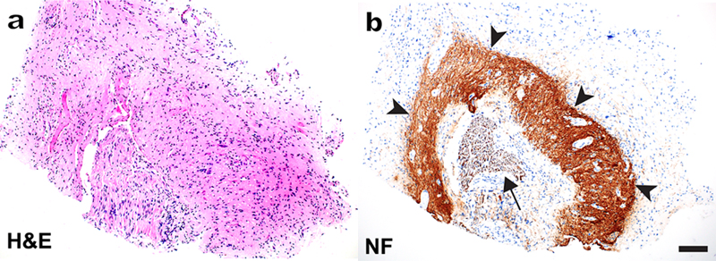 Figure 3. Neuroglial stem cell-derived inflammatory pseudotumor (n-SCIPT): A representative H&E-stained paraffin section (a) shows a spinal cord nerve root surrounded by haphazardly organized but otherwise mature-appearing neuroglial tissue. Neurofilament immunohistochemistry (b) highlights intensely stained but disorganized nerve cell processes (arrowheads) that surround the centrally located nerve root (arrow); the tissue at the periphery of the specimen shows glial differentiation and is neurofilament-negative. Chronic inflammatory infiltrate was apparent on other sections; for additional images and clinical history details, see the original publication (Sloan et al., 2019). Scale bar, 100 µm. 4. Congenital myopathies: New pathogenetic mechanisms Congenital myopathies are a group of genetically and clinically heterogeneous disorders that typically present early in life with weakness / hypotonia and delayed motor development, and are subsequently characterized by a stable or slowly progressive disease course. Histopathologic findings are variable and include type 1 fiber predominance and atrophy, cores and/or minicores, mislocalization of intracellular organelles (including nuclei), and various sarcoplasmic inclusions (such as nemaline rods, caps, and cytoplasmic bodies). The well-established pathogenetic mechanisms include impairments of calcium homeostasis, excitation-contraction coupling, sarcomeric filament assembly, force generation, and membrane remodeling. Excitingly, this mechanistic spectrum has been significantly widened by the work published in 2019. Some of the newly discovered mechanisms include (i) cell cycle acceleration accompanied by reduced cell growth (Villar-Quiles et al., 2019), (ii) impaired redox balance (Lornage et al., 2019), (iii) altered muscle kinetics due to impaired sarcomere relaxation (de Winter et al., 2020), and (iv) nuclear dysfunction secondary to impaired contractility (Ross et al., 2019); these last two studies are particularly groundbreaking and will therefore be described in a greater detail. Nemaline myopathy (NM) can be caused by mutations in at least 13 genes, the great majority of which encode proteins that either form thin filaments or are associated with these filaments. A recent tour-de-force study by de Winter et al. (2020; advanced electronic publication in 2019) has established that KBTBD13 (kelch repeat and BTB domain containing 13), the mutations in which cause NEM6 subtype of NM, is also an actin-binding protein; when mutated, KBTBD13 impairs sarcomere relaxation by altering the structure of thin filaments. Specifically, thin filaments are more tightly wound and stiffer than normal when they are bound to mutant KBTBD13R408C; this change in the thin filament compliance disrupts the positive feedback loop that is required for thin-thick filament detachment, resulting in slowing of muscle relaxation that clinically characterizes NEM6. Given the 8:1 stoichiometry of KBTBD13-actin binding, which is close to the 7:1 stoichiometry between troponin / tropomyosin and actin, it is possible that KBTBD13 acts in concert with those well-known sarcomeric regulatory proteins to fine-tune muscle contraction kinetics. Interestingly, deletion of KBTBD13 in mice does not lead to slower muscle relaxation, suggesting that KBTBD13R408C is a gain-of-function mutation. It remains to be shown whether other mutations in this gene lead to similar functional deficits and to elucidate how defects in muscle relaxation ultimately lead to production of nemaline rods (which are recapitulated in the mouse KBTBD13R408C knock-in model). In 2019, we have also learned that impaired contractility and abnormal cytoskeletal organization produce secondary nuclear deficits, which structurally – and possibly functionally – mimic nuclear abnormalities seen in patients with mutations in the nuclear envelope proteins, such as lamins, nesprins, and emerin (Ross et al., 2019). Abnormal spacing of myonuclei, nuclear envelope defects, and chromatin alterations were present not only in the skeletal muscle from patients with two different genetic forms of NM and NM model mice, but also in skeletal muscle from patients with acquired (immune-mediated) forms of NM, underscoring that these nuclear abnormalities are secondary to impaired contractility rather than a direct consequence of NM mutations. In addition, muscle fibers from both NM patients and NM model mice showed extensive cytoskeletal disruption (disorganized microtubules, mislocalized intermediate filaments composed of desmin, and altered cortical microfilaments composed of actin); given that treatment with microtubule-disrupting agents was shown to alter nuclear shape in vitro, these cytoskeletal alterations likely also contribute to nuclear deficits seen in the NM muscle. Indeed, we have recently observed very similar nuclear defects in a patient with a desmin mutation (Fig. 4); thus, secondary nuclear defects (and consequent gene expression changes) may be an important but overlooked cause of muscle dysfunction that is more widespread than currently recognized.
