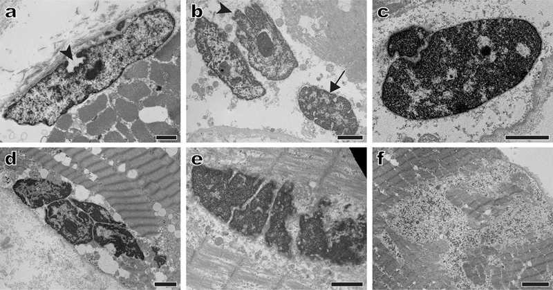 Figure 4. Nuclear abnormalities in a case of myofibrillar myopathy caused by a desmin mutation: Representative electron micrographs show marked nuclear abnormalities (a-e) including invaginations of the nuclear membrane (a and b, arrowheads), abnormally dense chromatin (the nucleus highlighted by the arrow in b, as well as nuclei in c and d), and nuclear fragmentation (c-e). Granulofilamentous material (f), a clue to the correct diagnosis, was seen only focally. Subsequent genetic testing revealed a heterozygous DES gene mutation [c.1237_1239delGAG (p.E413del)]. Scale bars: a and e, 1 µm; b-d, 2 µm; f, 4 µm. 5. Sporadic inclusion body myositis: The role of terminally differentiated cytotoxic T cells Sporadic inclusion body myositis (sIBM) is the most common skeletal myopathy affecting people over the age of 50; it typically presents with a weakness of the quadriceps and deep finger flexor muscles, has a slowly progressive course resulting in eventual loss of mobility, and is currently without effective therapy. Pathologically, sIBM shows both inflammatory and myodegenerative features (Fig. 5a); together with a lack of response to immunosuppressive treatment, this “dual” nature of sIBM pathology has led to a long-standing disagreement about the role of inflammation in sIBM pathogenesis.Three studies published in 2019 (Dzangue-Tchoupou et al., 2019; Greenberg et al., 2019; Knauss et al., 2019) will likely break this impasse by providing a strong support for the autoimmune nature of sIBM: starting with different questions and using different experimental approaches, these studies have demonstrated that terminally differentiated effector memory T cells (so-called TEMRA cells) are enriched in sIBM muscle biopsies (Greenberg et al., 2019; Knauss et al., 2019) as well as peripheral blood of sIBM patients (Dzangue-Tchoupou et al., 2019), and that the presence of these cells is fairly unique for sIBM when compared to other IIMs [although similar cells were also seen in biopsies from two patients with severe, treatment-resistant irMyositis (Knauss et al., 2019)]. TEMRA cells are positive for CD8, T-bet (a transcription factor that drives differentiation of naïve T cells into cytotoxic T lymphocytes), CD57 (a marker of replicative senescence), and KLRG1 (killer cell lectin-like receptor G1; a marker of T cell exhaustion). They contain high concentration of cytotoxic enzymes (granzymes and perforin) that likely directly cause muscle fiber damage, are known to increase in peripheral blood with age, and are resistant to corticosteroids and drugs that target actively dividing cells (such as methotrexate); the latter two characteristics likely provide at least partial explanation for the age dependence and resistance to immunosuppression that are characteristic of sIBM.