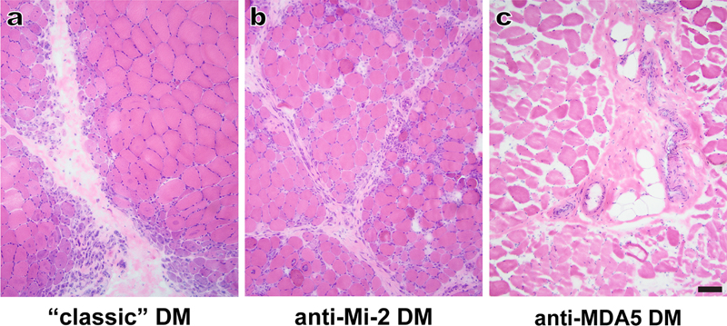 Figure 6. Dermatomyositis (DM) variants: (a) A “classic” DM case shows marked perifascicular fiber atrophy but no significant inflammation in the perimysium or endomysium; the patient’s antibody status is not known, but the overall clinicopathologic findings fit best with the anti-TIF1γ-associated DM. (b) A typical case of anti-Mi-2-associated DM also shows perifascicular atrophy, but could be confused with anti-synthetase syndrome-associated myositis given the presence of perimysial and focally endomysial inflammation, perimysial fragmentation, and patchy necrosis of perifascicular muscle fibers. (c) A case of anti-MDA5-associated DM shows moderate processing artifacts but no significant pathologic changes; the only significant abnormality was mild upregulation of MHC-I complex in all muscle fibers (not shown). For all three cases, images show representative H&E-stained cryosections. Scale bar, 100 µm. Histopathologically, most cases of DM, IMNM, ASM, and sIBM are easily distinguishable [for a review of up-to-date pathologic criteria, see Tanboon and Nishino (2019)]; however, a few entities can create diagnostic difficulties. For example, anti-MDA5-associated subtype of DM generally lacks perifascicular atrophy (a key diagnostic feature of DM; Fig. 6a) and can therefore mimic IMNM or even normal muscle (Fig. 6c), while anti-Mi-2-associated DM shows prominent perimysial inflammation and perifascicular fiber necrosis that can mimic ASM (Fig. 6b). The interferon-induced gene expression signatures associated with different IIM classes, which were defined in two separate studies published in 2019 (Pinal-Fernandez et al., 2019; Rigolet et al., 2019), confirm the validity of the current IIM classification and identify immunohistochemical markers of these interferon responses, which will likely prove diagnostically useful. In particular, both studies have shown that all subtypes of DM (including the histologically atypical cases associated with anti-MDA5 and anti-Mi-2 antibodies) show activation of the type I interferon (INFα/β) pathway and prominent upregulation of IFN1-inducible genes such as MxA (myxovirus resistance protein A), which can be used as an immunohistochemical marker of the INF1 response. In DM, MxA generally shows sarcolemmal staining in perifascicular fibers; the exception is anti-MDA5-associated DM, where MxA staining is scattered or diffuse but not perifascicular (Tanboon and Nishino, 2019). In contrast, both ASM cases (regardless of the nature of the associated anti-synthetase antibody) and sIBM cases show activation of the interferon type II pathway (i.e. upregulation of INFγ-inducible genes); MHC-II, an immunohistochemical marker of INFγ activation, can be used to monitor this pathway in muscle biopsies (Rigolet et al., 2019) and could therefore be useful for distinguishing ASM from anti-Mi-2-DM in challenging cases. [Of note, DM muscle biopsies do show a weak activation of INFγ pathway (Pinal-Fernandez et al., 2019; Rigolet et al., 2019); however, at least for MHC-II proteins that activation is several orders of magnitude lower than in ASM and sIBM biopsies. Thus, it should be possible to optimize MHC-II staining to effectively differentiate between DM and ASM cases.] Finally, both studies found that IMNM biopsies do not exhibit either type I or type II interferon signature, further validating their separation into a separate IIM category (Pinal-Fernandez et al., 2019; Rigolet et al., 2019). Thus, neuromuscular pathology laboratories that see a lot of IIM cases should consider adding MxA and MHC-II immunostains to their stain repertoire, so that these markers can be evaluated in diagnostically challenging IIM cases. What are the sources of INFα/β and INFγ that drive these differential responses? That remains to be definitively established; however, the most likely candidate for the INFα/β source are plasmacytoid dendritic cells, which are increased in DM muscle, while the most likely candidate for the INFγ source are CD8+ T cells, which were observed in a close vicinity of MHC-II-expressing fibers in both ASM and sIBM (Rigolet et al., 2019). 8. Emerging diagnostic techniques The reduced cost and widespread availability of advanced genetic testing techniques [such as disease gene panels and whole exome sequencing (WES)] have led to a dramatic diagnostic improvement for many inherited NMDs. However, even with the aid of these advanced molecular techniques, 50-75% of presumed genetic NMD cases currently remains undiagnosed (Cummings et al., 2017); the underlying reasons include challenges involved in interpretation of the variants of unknown significance and of variants in the genes previously not linked to human disease, the inability of these techniques to detect certain types of genetic alterations (such as structural re-arrangements and copy number variants), and the lack of coverage of intronic and regulatory regions (Gonorazky et al., 2019). In such diagnostically challenging cases, transcriptome analysis (RNA-seq) will likely prove beneficial. Indeed, a recent study has shown that RNA-seq resolved 36% of their panel- and/or WES-negative NMD cases (Gonorazky et al., 2019); an essentially identical diagnostic yield (35%) was reported in a 2017 study that used a different NMD patient cohort (Cummings et al., 2017). Importantly, gene expression is tissue-dependent; thus, the effectiveness of RNA-seq for diagnostic testing hinges on the use of disease-relevant source material. In the context of genetic muscle disease, biopsied muscle represents the ideal specimen, while peripheral blood is inadequate; unmodified skin-derived fibroblasts can be useful for some diseases (such as congenital muscular dystrophies), but the diagnostic yield is substantially enhanced if fibroblasts are transdifferentiated into myotubes in vitro (Gonorazky et al., 2019). Importantly, expression of the muscle-specific transcripts was significantly lower in transdifferentiated myo
