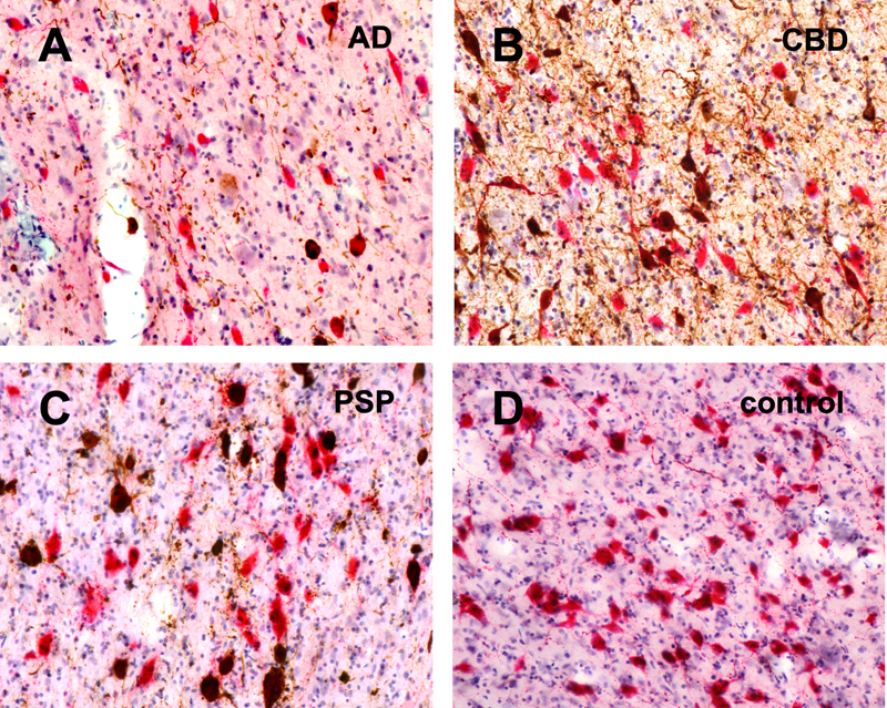 Figure 4. Tau pathology in the locus coeruleus in Alzheimer’s disease compared to progressive supranuclear palsy, corticobasal degeneration and controls. Double-label immunohistochemistry showing colocalization of tau pathology (brown) and norepinephrine (red). Figure courtesy of Dr. Lea Grinberg. 6. Periodontal disease as a risk factor for Alzheimer’s disease Neuroinflammation is a well-recognized feature of AD, with activation of microglia, inflammasomes, and complement. Over the years, a number of infectious agents have been postulated to trigger this inflammation and participate in disease pathogenesis. The Aβ peptide itself has even been demonstrated to have antimicrobial properties, supporting this hypothesis. One candidate pathogenic agent that has emerged is Porphyromonas gingivalis, a pathogen that plays a critical role as a keystone pathogen in chronic periodontitis (CP). Previously, among other supportive data, P. gingivalis was shown to be associated with cognitive decline in AD patients compared to controls without CP. Furthermore, oral infection of Apoe-/- transgenic mice resulted in brain infection and complement activation. In a paper published in Science Advances, researchers led by Drs. Jan Potempa (University of Louisville) and Stephen S. Dominy (Cortexyme) have provided the strongest evidence yet that infiltration of the brain with P. gingivalis might be causal and that their toxicity is through their virulence factors termed gingipains (Dominy et al., 2019). Gingipains are secreted cysteine proteases that play critical roles related to host colonization, inactivation of host defenses, iron/nutrient acquisition, and destruction of tissue. These researchers demonstrated the presence of gingipains in post-mortem AD brain tissue alongside the presence of P. gingivalis DNA. Remarkably, treatment with a small molecule gingipain inhibitor blocks gingipain-induced neurodegeneration in an animal model with an associated decrease in host Aβ response to P. gingivalis. This orally available gingipain inhibitor is currently being tested in human clinical studies. More work needs to be done, and it is anticipated that this work might trigger a new research trend around periodontal disease in AD. 7. Deconstructing cerebellar degeneration using “patholog-omics” Essential tremor (ET) is a common condition that can be associated with significant morbidity. For many years, the neuropathological features underlying ET had been a complete mystery, with autopsy studies being limited and qualitative. Recently, investigators have been building large cohorts of ET patients and a series of ET-related neuropathological changes have been reported, but many had been observed in other neurodegenerative diseases affecting the cerebellum, raising questions of specificity. How these features and the other cerebellar degenerations are related had never been formally or systematically studied. In what could be considered a tour de force, investigators led by Drs. Elan Louis (Yale University) and Phyllis Faust (Columbia University) published as landmark paper in Acta Neuropathologica applying what they termed a “patholog-omics” approach using 37 quantitative morphological metrics (Louis et al., 2019). They compared 156 brains from healthy controls and patients with a spectrum of cerebellar diseases, including essential tremor, spinocerebellar ataxia, multiple system atrophy, Parkinson’s disease, and dystonia, mapping unique cellular patterns of neurodegeneration. Measures included Purkinje cell loss, axonal changes (e.g., torpedoes), basket cell hypertrophy, climbing fiber synaptic changes and others. They then used principal component analysis to derive distinctive and overlapping signatures marking each of these disorders. This study, which is the first of its kind to attempt to apply “omics” approaches to histomorphology, paves the way towards applying the approach to other neurodegenerative diseases. 8. Chronic traumatic encephalopathy and American football: a dose-response relationship While the fact that repetitive mild traumatic brain injury leads to devastating long-term sequelae in professional boxers has been recognized for close to a century without controversy, chronic traumatic encephalopathy (CTE) only recently began to achieve substantial scientific scrutiny and public interest when it was identified in American football players. While there is strong evidence that repetitive head injuries are causal for CTE, skeptics remain. Among the criticisms is that while clinicopathological studies are powerful, they are association analyses that ostensibly cannot prove a causal relationship on their own. This is not the whole story. In 1965, Sir Austin Bradford Hill, an English statistician, proposed nine criteria that, when met, provide epidemiologic evidence of causality. In terms of CTE, eight of these criteria had been met, including strength (effect size), reproducibility, specificity, temporality, plausibility, coherence, experimentation and analogy. The missing criterion, until now, was evidence of a biological gradient: the presence of a dose-response relationship showing that increased exposure leads to a greater incidence/magnitude of the effect. In a report published online in November 2019 in the Annals of Neurology, researchers led by Drs. Jesse Mez and Ann C. McKee (Boston University) measured exposure to contact sports in the largest autopsy series of American football players ever assembled and calculated CTE risk. They found that the odds of CTE doubled with every 2.6 years of American football played (Mez et al., 2020). This paper firmly establishes that there is a dose-response relationship between exposure to American football and CTE, which the strongest indicator of causality obtainable. This study also provides hard data for athletes and families trying to determine how much exposure might be considered safe. 9. Parkinson’s disease: the gut-brain connec