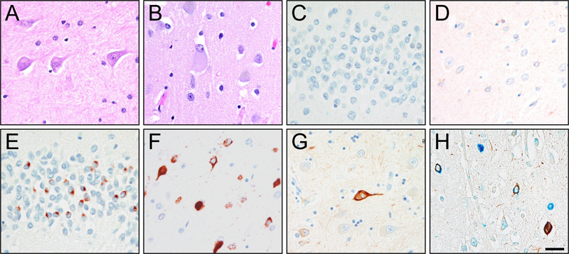 Striatal atrophy was not seen in many NIFID cases (A; Case 5) and was only observed in two cases (B; Case 6). Conversely, only one aFTLD-U case lacked marked striatal atrophy (C; Case 14) while the rest of the aFTLD-U cases demonstrated severe atrophy (D; Case 13) [bar: 1 cm]. Light microscopy Results of the light microscopic examination are shown in Table 2 and Figure 2. None of the 15 cases had evidence of tau deposition, and none met criteria for Alzheimer’s or Lewy body disease. All 15 cases were immune-reactive to ubiquitin. Thirteen of the 15 cases had neuronal inclusions that were immune-reactive to FUS. Seven of the 15 cases had eosinophilic inclusions that were seen on hematoxylin and eosin and were immunostained for α-internexin in keeping with their pathological diagnosis of NIFID. None of the remaining eight cases that had been diagnosed as aFTLD-U showed α-internexin immunoreactivity. Seven of the eight aFTLD-U cases (88%) showed severe striatal atrophy with FUS-positive neuronal cytoplasmic and vermiform intranuclear inclusions. Of the seven NIFID cases, five cases had neuronal inclusions that were immunoreactive to FUS. Unlike in aFTLD-U, striatal atrophy was only present in only 2/7 (29%) of the NIFID cases, both of which were FUS positive. Hence, neither of the two FUS negative NIFID cases had striatal atrophy. Therefore, 9/13 cases with FUS immunoreactive inclusions showed striatal atrophy while 0/2 without FUS showed striatal atrophy. Surprisingly, one of the two NIFID cases without FUS immunoreactivity had lesions that were immunoreactive for both α-internexin and TDP-43 (Figure 3). Figure 2: Alpha-internexin and FUS pathology