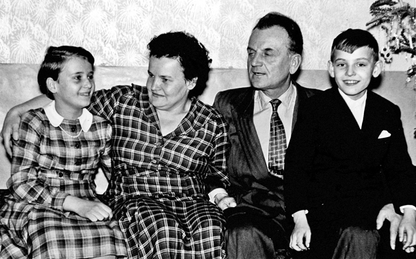 Fig. 1. The family in the mid-1950s. My father was also a good tennis player, and with tennis he was more successful to get me interested than with the piano. Indeed, I became a quite good junior player who could play competitively in a tennis club and even in the Austrian Boy Championship (age bracket 12-14) where I was able to get into the quarterfinals. The tennis league tournament between clubs always included one slot for a junior (up to an age of 18). Unfortunately, I was the only junior of my club interested to play competitively, and this already at an age between 12 and 14. At that early age, I already had to compete with 18-year-old players. I mostly lost such matches, as my competitors were much taller and shot much stronger serves than I was able to do. This was one, but not the only, reason why I increasingly lost interest in tennis; the other was my awakening interest in girls that kept me more and more occupied in the later teenage years. My primary school, then of course gender-separated, was also in the heavily damaged quarter where we lived first in Vienna, and I was fortunate to get a highly motivated and skilled teacher, Mr. Pokorny. I had no problems at all at school; already in kindergarten I had learnt unintentionally everything by listening and looking how my sister in her first class learnt to read and write. Later, I just listened during school lessons and remembered everything, without a need to repeat. At my age of 11, after the first year in a municipal high school, my father was so proud of my school performance to have me switching to an élite gymnasium, the Theresianum that was founded in the 18th century by Empress Maria Theresia for the higher education of kids (of course only boys!) of aristocrats and public officials. At the time, it just re-opened again after WWII with a newly composed team of qualified teachers. It was a private boarding school where about one half of the kids – the interns – lived and slept there and had only occasional permission to visit their families elsewhere in the country. The other half including me – the half-interns – stayed there for the day and went back to the family in the evening, then a highly unusual schooling schedule. Focus was on languages: starting with English at age 10, Latin was added after two years, French after two more years, and finally Russian after one more year. Apparently subconsciously, I decided that three foreign languages should be enough – my schoolmates obviously felt the same –, and took Russian quite lightly. Now I would be most happy if I could read Tolstoy in the original version, but all what has remained is the Cyrillic alphabet and a beautiful poem by Lermontov that we had to learn by heart. We had opportunities to practice all types of sports, including soccer and athletics fields in the huge park, and swimming in an indoor pool. So every early afternoon we rushed out for about two hours, mostly for playing soccer; this was a feeder for my lifelong love for sports and physical exercise in general. However, we also had some 2 or 3 hours of obligatory study time in the late afternoon. We were about 25 boys in our class. While most teachers were real experts in their field, some were less competent in paedagogic terms and even helpless in front of a bunch of merciless juveniles. The same went for the social knit among classmates – there were the usual fluctuating cliques that bullied outsiders. Now, after more than five decades, I still feel ashamed not to have intervened then and would want to apologise to bullied classmates and teachers. Personally, I tried to steer clear of cliques without becoming an outsider, a habit of independence that I have cherished through my whole life. In 1964, at 18, we had our final exam (Matura, Abitur) where I got excellent marks. Our class quickly distributed to all corners of the world, and I met most classmates again only later at reunions after 50 and 55 years. Some proved to have learnt little from life, playing the same clique stereotypes as during their teenage years. Astonishing but probably not so unusual. We had nobody with a medical background in the family. However, since I was some 10 years old, it was absolutely clear to me that I would become a medical doctor. I cannot remember a reason or triggering event, it was a matter of course. My career in (neuro)pathology started with the section of a sparrow who broke its neck by flying against a glass window, and that of a goldfish found dead in an aquarium. I just wanted to know how the inside looked like, and what was the very reason for death. This hunger for knowledge also accompanied my medical studies. I was totally immersed and – although I consider myself a true product of the 1968 generation in attitudes and spirit – in fact did not take much note of, nor participated in, the upheavals and demonstrations that paralysed university life in 1968. I kept this no-commitment tradition in politics for long, with one notable exception: having just graduated as an MD, I participated in a demonstration by doctors for better pay and working conditions. I felt it somehow obligatory to participate, now that I was a doctor myself. A few hundred white-coated people ceremoniously marched down the famous Ringstrasse with banners and slogans, but increasingly my attention was drawn to what happened between demonstrators and onlookers. It was impossible to overlook the strong emotions elicited in surrounding spectators, shouting curses at doctors who were considered privileged over common people and earning too much anyway. It was frightening indeed: a spirit of outright hatred had seized many. With a feeling how easy control might be lost, I decided to never again go to the streets, valid until today. Medical study at the time had a relatively free schedule; you just had to pass some practical exercises and a defined sequence of about 20 rigorous oral examinations, rigorosa. It was up to 