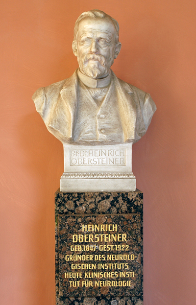 Fig. 2. Bust of Heinrich Obersteiner, having its traditional place immediately behind the glass-wooden doorway of the Neurological Institute (NI). My small kids occasionally visited the NI and were greatly impressed by this bust. After asking once to be allowed to tweak the stony cold nose, they did it again every time they visited. After NI’s move to the General University Hospital (AKH) in 1993, the statue was re-located to the Honour Courtyard of the University of Vienna building at Ringstrasse. When I started to work in the NI on Oct. 1st, 1971, nobody could foresee that I would stay there uninterruptedly until my retirement, on the day exactly 40 years later, a straightforward but highly unusual curriculum vitae for a scientific researcher. I realised only later the eminence of the NI as the first multidisciplinary institution of the neurosciences in the world. Founded in 1882 by Heinrich Obersteiner (Fig. 2) and blossoming under Otto Marburg until the collapse of the Medical Faculty by the advent of Nazism, it had become a model for such institutes elsewhere, from Fukuoka in Japan to Montreal, New York and Philadelphia. Absolutely unique was NI’s library that contained an unrivalled treasure of neuroscience books, in particular from the 19th century. It was Franz Seitelberger’s merit to have re-built the NI after WWII, from practically scratch with only a single half-time position, to a nationally and internationally recognised centre of excellence when he became professor emeritus in 1986. At my entry to the NI, it was a composite of several disciplines led by distinguished scientists (Fig. 3). Tumour and autopsy neuropathology was led by Kurt Jellinger; neuromuscular neuropathology by Elfriede Sluga who mainly worked the NI’s own electron microscope; neuropathology of the vegetative nervous system by Gustav Lassmann; neurochemistry by Hans (Hanno) Bernheimer; neurophysiology by Hellmuth Petsche; and neurolinguistics by Karl Gloning. Soon another young aspiring researcher arrived, Hans Lassmann, to establish a lab of experimental neuropathology.