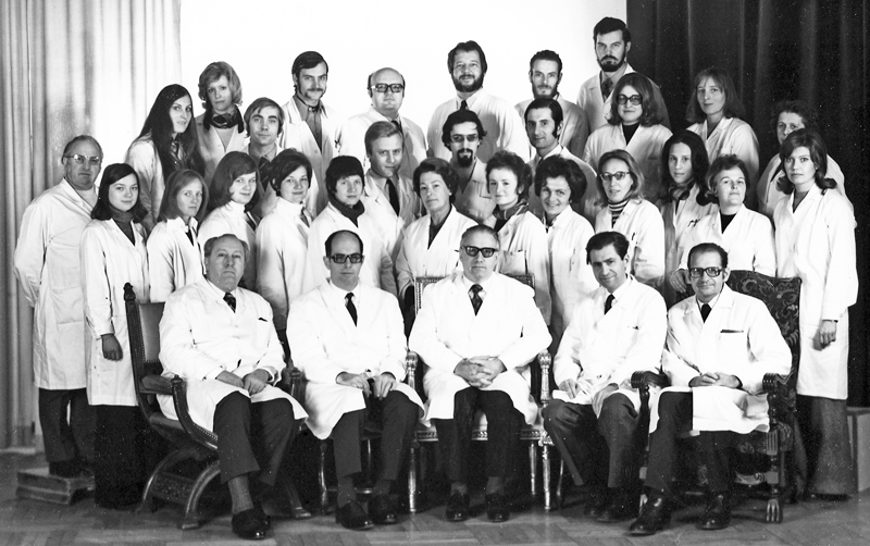 Fig. 3. People working at the NI in the early 1970s. 1st row, sitting from left: Lassmann sen., Petsche, Seitelberger, Jellinger, Gloning; 2nd row: 4th from right, Sluga; 3rd row at left Auff; last row, 2nd from left Budka, 4th Bernheimer. Unnamed persons include the indispensable workforce of technicians and secretaries. Note the distinctive traditional hierarchy, as evident from the arrangement of this photograph, that then imbibed NI’s atmosphere everywhere. In the NI, I was supposed to become Kurt Jellinger’s assistant and, over some 3 years, was given a unique chance to familiarise with neuropathology in my very personal way, by re-examining the huge histopathological collection and compare my fresh impressions with the available written reports. This autodidactic learning style was well in agreement with both my and Kurt’s self-absorbed approach to work. For about half a year, I did not really know how to appropriately re-examine an autopsy case with very large-sized microscopic sections. It took me half a day to microscope such a section, as I mainly used high magnifications and even the oil immersion objective! No wonder that I saw an astonishing new universe of structures of amazing shapes, sizes and colours. After about a couple of weeks of such microscoping, I saw something really bizarre, a rounded body with a strange and multicoloured structure. Consulting not only oil immersion but also textbooks, I could not find anything that resembled this discovery. I got very excited and immediately informed Prof. Seitelberger who, after a shared microscoping session in his office, agreed about the novel character of this strange body. He even suggested to publish it together, and advised me to take microphotographs. Of course I had no idea about microphotographing and admitted that. No problem, he replied and pointed to a small mountain of something hidden under a huge dusty cover in one corner of his room. He would do it himself, as that photomicroscope was the very best in the world. I should come back in about one week. So I asked after one week and weeks thereafter, but he always answered to have been too busy to do it. Then, there was no need anymore to document the strange body: I found out by myself that it was a corpus amylaceum, an extremely common structure produced by astroglia, occasionally looking a bit unusual. As working space was scarce in and between the lab rooms crammed with instruments and equipment, I was given a desk and microscope within the Lecture Hall, a huge room with large windows and old-fashioned seating rows (Fig. 4). Already a postdoc from Japan had arrived, Riki Okeda, a new friend who later became professor of neuropathology at Tokyo Medical and Dental University. Another close friend, Ferenc Garzuly who became Head Neurologist in Szombathely, Hungary, completed our trio there. It was much fun – we had small parties, Riki used to play the violin, and we took everyday a nap after lunchtime snoring in the seat rows. When I recently told Ferenc that I am writing up my memories, he obliged me to mention my first day in the Lecture Hall when I drew onto the chalkboard a cell nucleus to demonstrate a “wonderful” change, but both Ferenc and Riki could not detect anything unusual. Yes, already on my first day I thought to see something special and difficult for others to see. Moreover, according to Ferenc, I must mention to have had a green metal box with some gadgets that made enough noise to prevent both of them from sleeping in the seat rows.