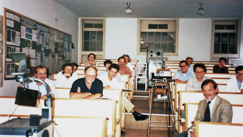 Fig. 4. The Lecture Hall of the NI in 1991 during an informal meeting. Hans Lassmann at far left, the author at right in front, Thomas Berger, the present Director of the Neurological Clinic of the Medical University Vienna, in rows at right, 3rd from front.