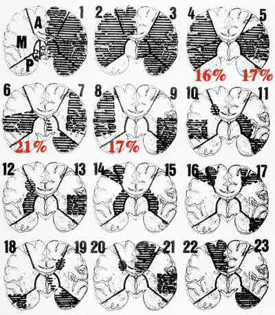 Fig. 5. Topographical patterns of brain infarcts in 196 autopsies with verified occlusions in the carotid-media vascular supply. Among the 23 patterns that highlight the eminent individual variability by site and extent of brain infarction, the percentage of the four most frequent patterns (total, subtotal, central and peripheral media infarcts, in sum 71%) are indicated in red. Vascular areas: A = anterior cerebral artery, M = media, P = posterior, ChA = A. choriodea anterior, Cp= A. communicans posterior. Modified from ref. [1]. In that early time, one of my few responsibilities was taking macroscopic photographs during brain cutting sessions, taking place every Wednesday morning (Fig. 6). I made several experiments to optimise that type of documentation: the best background for colour contrast was finally settled as a dark blue, and whole brains and brain slices were arranged on a glass plate some 10 cm above the background cloth, in order not to have any interfering shadows when the illumination was from both sides.