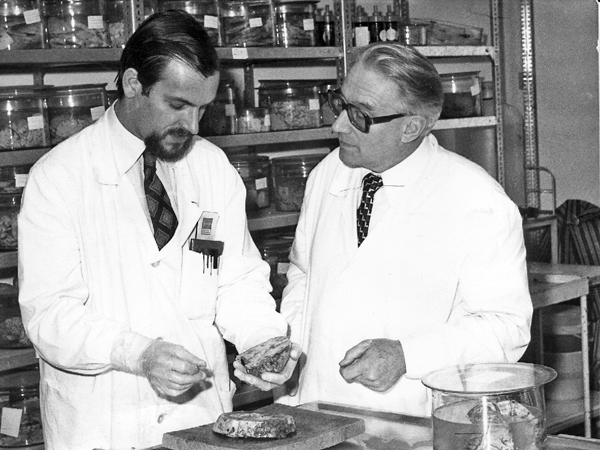 Fig. 6. Brain cutting session with Prof. Seitelberger in the 1980s. Note the numerous fixed brains in glass jars in the back – and the formal ties everybody wore then during work. One more responsibility was to visit the Department of Pathology every early morning, in order to determine which autopsy brains would be interesting and important enough to be fixed for neuropathology. At that time, autopsies still numbered more than 2000 per year, and not every brain could be fixed and examined. I still remember vividly the boss of the autopsy suite, Prof. Kucsko, in the beautiful old building of the Institute of Pathology (now the Institute of Brain Research) where already Carl von Rokitansky had worked. Kucsko was a gaunt chain smoker always with a cigarette butt on his lips during a whole section. He was an extremely experienced pathologist who taught me great respect for the autopsy as golden standard and one of the most difficult tasks in medicine, less with regard to skills but more to generalised knowledge, experience and “feeling”, a talent somewhat difficult to explain by words. Another lesson I learnt from him is the importance of a very detailed macroscopic examination – what you do not see or at least suspect at gross dissection, you have little chance to find by microscopy. Initially he had little consideration for that young guy interested only in the brain. However, once I told him that I found small cancer metastases in the brain when the body section by him had not found anything. Can’t be, he snapped, and went back to the inner organs that fortunately had been fixed and were still available. He called me back in the afternoon to confirm that, indeed, no tumour was found in the body. When I stayed firm with my metastases, he went back again to the fixed organs and finally found, after 3 days of cutting almost every millimetre, a tiny scar carcinoma of the lung. After that I had some reputation with him and was free to express my wishes for neuropathology. This came in handy when Kurt ordered me to freeze fresh brain slices from then relatively many Creutzfeldt-Jakob disease cases autopsied in Vienna. I had to send them on dry ice to D. Carleton Gajdusek at the NIH in Bethesda, for transmission experiments into non-human primates. I did that without any special safety precautions that then were unheard of, and retrospectively I am not sure whether I touched these brains by bare hand or not. I was later very proud to have contributed some part, even when minuscule, to Carleton’s Nobel prize in 1976. Kurt Jellinger left the NI in 1975 for a position of Head of a Department of Neurology in the municipal Lainz Hospital in Vienna where he could do both clinical neurology and neuropathology. Of course, this was a severe blow for the NI, but in particular for me, as suddenly all responsibilities for diagnostic neuropathology were mine. Kurt was the collector type of neuropathologist who always had large case numbers available for his research. During my years with him, the number of neuropathological autopsies was as high as 600 per year, and neurosurgical biopsies numbered around 1000. Only he could handle such a volume alone or with one assistant, and when he left, I – a newcomer with only 3.5 years in business – was almost alone to shoulder such tremendous quantities. I decided quickly to give priority to tumour pathology, and for several years I was unable to keep up with the flow of autopsy cases even when, by necessity, they had to be reduced to a significant extent. To lose Kurt at that time was still more painful to me, as I just had entered into clinical training. Traditionally all MDs of the NI had training in a clinical speciality (to become Facharzt or consultant), usually neurology rather than pathology. Neuropathology became a speciality of its own in Austria only later, a development that I could push forward to a significant extent. To become a specialist in neurology and psychiatry, I started a year of internal medicine in 1974, psychiatry in 1975, and neurology in the following 4 years. It had been agreed beforehand with the directors of the respective clinics that I would do clinical training in the mornings until noon or early afternoon, and then continue my work in the NI where I kept my official position. Under these circumstances, it is not difficult to imagine what workloads I had to face when returning to the NI in the afternoon and working into the night. I soon became unsure whether I could, and should, carry on this double burden at all, a feeling of uneasiness and uncertainty that dominated the second half of my 1970s. Even under these extremely difficult circumstances, I soon realised that research was pre-eminent in importance for the career. As a relative newcomer, I was not sure in which topic I should invest, in preparation for the next step in career building, the habilitation (lectureship, to become Dozent). I had spent most of my year in internal medicine in haemato-oncology, then led by the very amicable Prof. Josef Kühböck, and could witness the successes as well as complications of then modern aggressive and even prophylactic chemotherapy of leukaemia and lymphoma. In parallel, I could collect a small but very interesting and then timely series of brains of patients who unfortunately had died with such complications. Thus I published “The pathology of encephalopathies induced by treatment or prophylaxis of neoplastic lesions of the nervous system”, again as a book chapter that I was proud of but became quickly forgotten; however, this time I wrote in English [2]. Another potential topic that I considered for habilitation was the neuropathological substrate of collagen vascular disease, again a publication that I was very happy with but went practically unnoticed, even in an American journal [3]. Finally, publication of the first description of the adult type of adrenoleukodystrophy (ALD), what is now called adrenomyeloneur