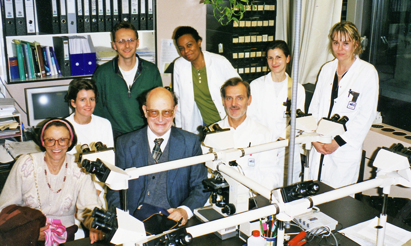 Fig. 7. Daily microscoping sessions were always held around the multi-head viewing microscope, here in the second half of the 1990s when an old and cherished friend and neuropathological giant, John Kepes with wife (in foreground) was visiting from Kansas City. Sitting behind them, Haberler at left and Budka at right, standing from left, Hainfellner, Hussun (a pathologist from Yemen), Jarius, Wanschitz. John had briefly stayed at the NI after the failed Hungarian revolution of 1956.