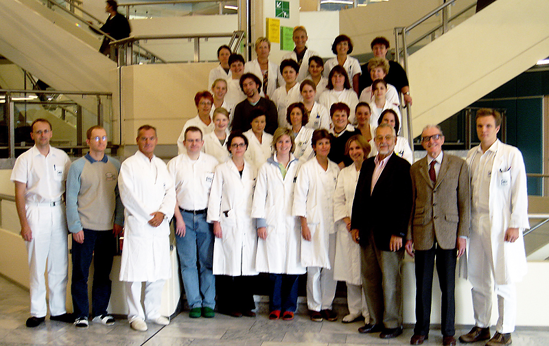 Fig. 9. The KIN staff in 2006. 1st row, from left: Hainfellner, Regelsberger, Budka, Ströbel, Gelpi, Pipp, Haberler, Höftberger, Bernheimer, Trabattoni, Preusser; behind, the dedicated laboratory and secretariat staff committed to the success of the institute. With increasing age, and success of KIN in general, I was awarded some prizes that recognised our work in some specific areas. Already as far back as 1982, I had received the Moore Award for the best paper on clinico-pathological correlation at the American Association of Neuropathologists (AANP) meeting; it was for my work on IHC in PML, and I was proud of it because I received the award despite the session chairman’s attempts to disturb my presentation. He insisted to limit the number of slides at my talk; so this was a very distinguished virologist who arbitrarily decided that a youngster had two slides too many than what he personally considered appropriate. No, Sir, I explained politely but firmly to him that I would definitely show all my slides, that numbers of slides don’t matter as long the allotted time frame is kept, but that he could, of course, stop me if I would go overtime. So good arguments do help youngsters against forceful professors. For explanation of the then highly publicised BSE and prion situation, I frequently gave scientific statements to the public by press, TV and radio. These were obviously well received, as I was awarded with the title of “Austrian Scientist of the year 1998”; the prize included also the naming of a star after the awardee in one of the far corners of the universe. In 2004 I received an honorary doctorate from the Medical Academy Łodz in Poland, and in 2008 I had the honour to give the Dorothy Russell Memorial Lecture at the British Neuropathological Society Meeting in London (Fig. 10).
