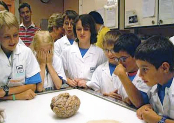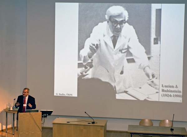 Fig. 10. Lecture at the award ceremony to receive the Dorothy S. Russel Prize by the British Society of Neuropathology in London 2008, in front of a memorizing image of my all-time hero, Lucien J. Rubinstein (photo courtesy of BNS). In 2007, we celebrated the 125th anniversary of the Institute by a dedicated symposium [32]. Many friends, including some from overseas, came to follow a series of lectures and posters on NI/KIN’s history and our more recent achievements. It appeared then that the future of KIN was safe and expected to prosper, and I even speculated whether I would live to see the Institute’s 150th anniversary in 2032. One of my concerns was to maintain and foster a good relation to the non-medical and non-scientific world that is funding everything we do. One possibility was the Children’s University when kids who visited KIN were told about our work and, most importantly, even could touch a human brain if they dared to (Fig. 11).