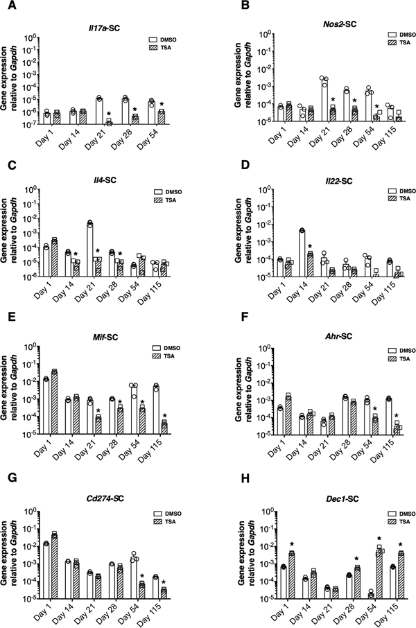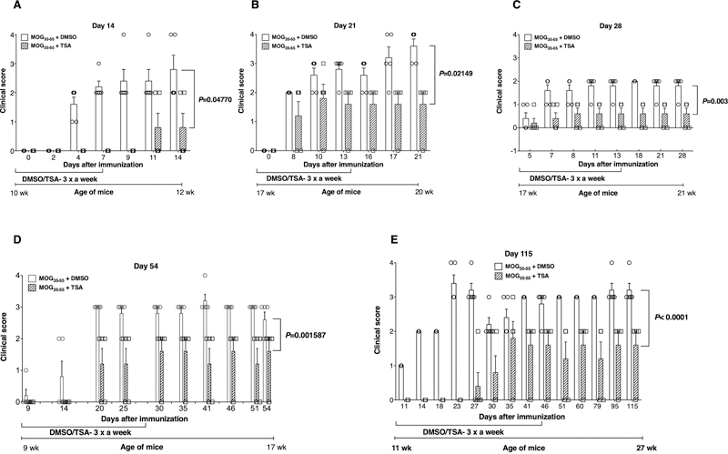 Fig. 1 TSA treatment improved clinical disease. All of the mice immunized with MOG35-55 developed PEAE without discernible remission (Fig. 1A-E), consistent with earlier reports (Basso et al., 2008; Jayaraman et al., 2017; 2018). The overall clinical severity was comparable in most instances except in a single experiment, probably due to the difference in experimental conditions (Fig. 1C). Treatment with TSA bestowed robust and irreversible protection from PEAE for the entire period of observation (115 days) even after the cessation of the drug administration on day 45 (Fig. 1E), as reported earlier (Jayaraman et al., 2017). Interestingly, the administration of the drug for one (Fig. 1A), two (Fig. 1B, C), four (Fig. 1D) or six-weeks (Fig. 1E) afforded a comparable level of protection against the disease. In previous studies, we have demonstrated that chronic TSA treatment decreased the influx of neutrophils and CD4+ T cells into the SC. Drug treatment also reduced the inflammation and particularly axonal damage in the spinal cord, indicating the neuroprotective effect of the HDAC inhibitor (Jayaraman et al., 2017; 2018). To understand the underlying mechanisms of drug-mediated protection against PEAE, in the current study, we have concurrently profiled the gene expression in the CNS and SLO at various time points shown in Fig. 1A-E. 3.2. Differential impact of the histone modifier on gene expression in the CNS The neuronal disease induced in NOD mice resembled the ‘classic’ EAE except that it lasted longer than in most strains of mice (Slavin et al., 1998; Basso et al., 2008; Hidaka et al., 2014; Dang et al., 2015; Jayaraman et al., 2017; 2018). Since the SC is thought to be the primary target of the ‘classic’ EAE and the brain damage was selectively observed in 'atypical’ EAE (Pierson and Goverman, 2017), we profiled the gene expression in the entire SC. Expression levels of genes encoding 11 lymphokines, four cytokines, seven accessory cell surface-associated determinants, seven transcription factors, and 11 histone deacetylases (Hdacs) were investigated by qRT-PCR. Unimmunized mice were separately treated with DMSO or TSA to determine the impact of drug treatment on the constitutive level of gene expression. The data are indicated at the day-1 time point in all figures. Mice immunized with MOG35-55 were treated with DMSO or TSA starting from the day of immunization. The entire data sets are presented in Supplementary Fig. 1-5. Only the differences in gene expression that occur consecutively at more than one-time point but not those altered transiently or sporadically are highlighted herein. Longitudinal analysis during chronic PEAE revealed that some immune response-related genes were induced upon MOG35-55 immunization after a 7-14-day lag period in both the CNS and SLO. The Th cell-associated Il17a, Il4, and Il22 and the inflammatory cytokine gene Nos2 were upregulated for a prolonged period between 21 and 54 days in the CNS in different experiments (Fig. 2A-D). The epigenetic drug suppressed the expression of these genes that were upregulated by immunization. Surprisingly, the constitutive expression of Mif, Ahr, and Cd274 was also notably repressed by TSA treatment during the chronic phase of the disease (Fig. 2E-G). Unexpectedly, the pan HDAC inhibitor upregulated the expression of Dec1 (Bhlhe40), specifically during the late stage of PEAE (Fig. 2H).