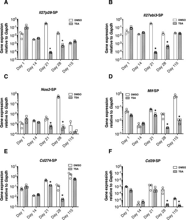 Fig. 2 Differential impact of the histone modifier on gene expression in the CNS. Although previous studies implicated many other genes in EAE, those encoding IL-23, IFN-γ, IL-18, IL-27p28, IL-27ebi3, IL-12p35, IL-10, GM-CSF, TNF-α, and TGF-β were not transcriptionally upregulated in the CNS of PEAE mice (see Supplementary Fig. 1-2). Similarly, the mRNA of the accessory cell surface-associated determinants, MMP9, MMP12, and CD74, remained stable in the CNS following immunization (Supplementary Fig. 3). Moreover, the transcription factor genes such as Tbet, Gata3, Rorgt, Eomes, and Foxp3 also remained unchanged in the SC (Supplementary Fig. 4). Notably, the histone modifier failed to alter the transcription of these genes. Thus, our comprehensive analysis uncovered the selective repression of genes in the CNS without affecting the levels of many other genes previously implicated in neuroinflammation. 3.3. The different patterns of gene regulation in the SLO by TSA treatment The expression of the genes encoding the subunits of the heterodimeric lymphokine IL-27 such as IL-27p28 and IL-27ebi3 peaked on day 21 and subsided steadily thereafter in the SLO (Fig. 3A-B). Treatment with TSA reduced the expression of these genes and the inflammatory gene Nos2 (Fig. 3C). Interestingly, the transcription of Mif, Cd274, and Cd39 in the SLO was also downregulated by the histone modifier (Fig. 3D-F). Surprisingly, the genes encoding the lymphokines such as IL-4, IL-10, IL-17A, IL-12p35, IL-18, IL-22, IL-23, IFN-γ, TGFβ, GM-CSF and TNF-α (Supplementary Fig. 1-2), as well as the macrophage-associated determinants, MMP9, MMP12, Arg-1, and CD74 were neither upregulated during pathogenesis nor repressed by TSA treatment in the SLO (Supplementary Fig. 3). Similarly, the transcription of Tbet, Rorgt, Gata3, Eomes, Dec1, Ahr, and Foxp3 remained mostly unaffected by the HDAC inhibitor treatment (Supplementary Fig. 4). Thus, the antigen-induced transcription of Il27p28, Il27ebi3, and Nos2, as well as the constitutive expression of Mif, Cd274, and Cd39, were selectively impeded by TSA treatment in the SLO. These data collectively demonstrate the differential influence of epigenetic modulation on gene expression in the CNS and SLO in the PEAE model.