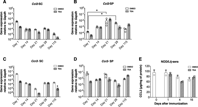 Fig. 3 Different patterns of gene regulation in the SLO by TSA treatment. 3.4. Epigenetic regulation failed to influence the prominent chemokine system Since previous work indicated the nonredundant roles of CCL2 and CCR2 in recruiting the inflammatory cells to the CNS (Mahad and Ransohoff, 2003; Moreno et al., 2014), we surmised that TSA-induced neuroprotection could also accompany modulation of these genes. Immunization of NOD mice with MOG35-55 did not transcriptionally upregulate Ccl2 in the CNS (Fig. 4A). On the other hand, Ccl2 transcription increased dramatically in the SLO between days 14 and 28 (Fig. 4B). However, TSA treatment failed to modulate the transcription of Ccl2 in the SC or SLO. The gene encoding the cognate receptor of CCL2, CCR2, was not distinctively upregulated in either the SC or SLO nor perturbed by the histone modifier (Fig. 4C-D). In contrast to the robust increase in the Ccl2 mRNA level in the SLO, the amount of CCL2 protein did not increase in circulation during the pre-symptomatic period (up to 16 days) as assessed by ELISA, which remained unaffected by TSA treatment (Fig. 4E). These data indicate that protection from PEAE afforded by the CNS-permeant TSA (Jayaraman et al., 2017; 2018) was not associated with the transcriptional regulation of the prominent chemokine system, CCL2: CCR2 either in the CNS or SLO.