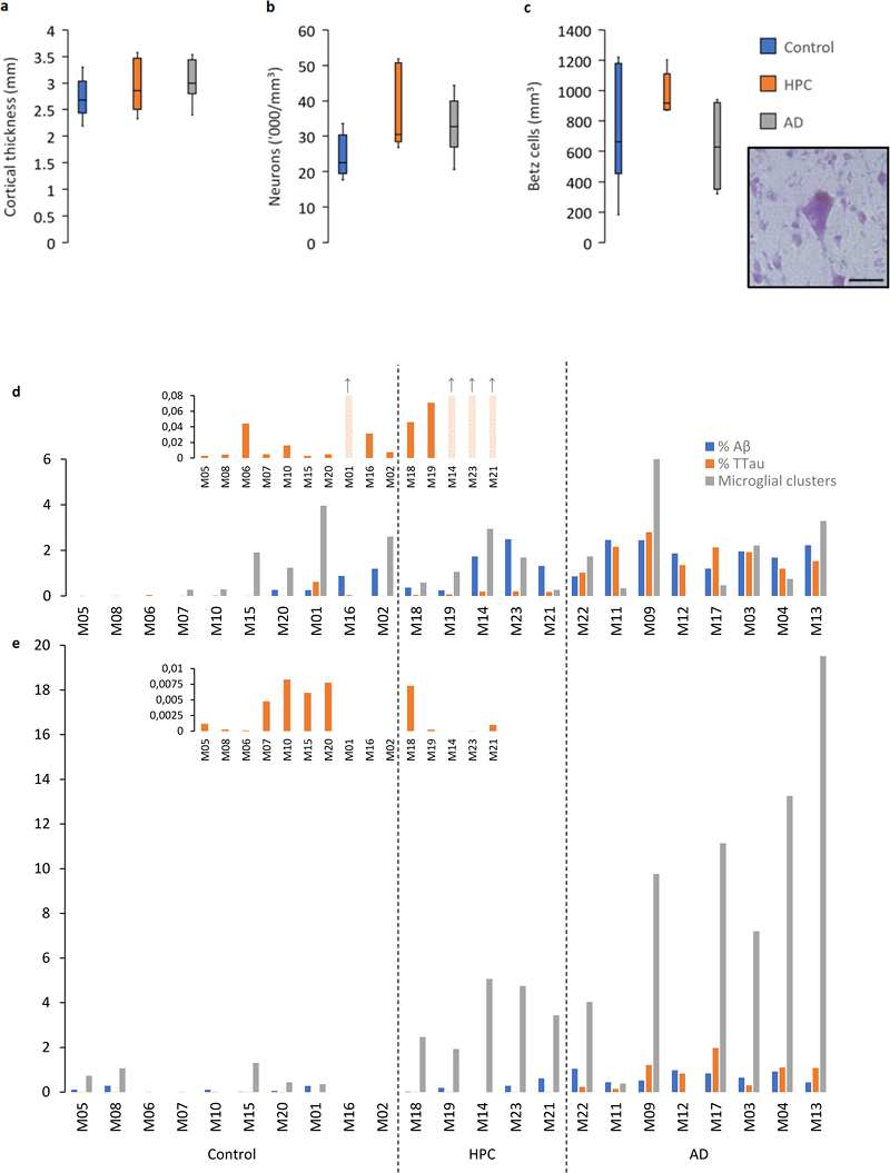 Figure 1 Characteristics of the PMC and regional neuropathological comparisons. a–c The PMC is spared of AD-related neurodegenerative changes as measured by cortical thickness (a), total neuronal density (b), and the density of layer Vb Betz cells (inset demonstrates a pyramidal Betz cell with multiple asymmetrically distributed perisomatic neurites, a prominent nucleolus, and a dark dense deposit of cytoplasmic lipofuscin) (c). d–e A cohort wide comparison of the percentage of Aβ and TTau immunolabelling and microglial clustering in the ITC (d) and PMC (e) demonstrates age-related tau build-up in a majority of control brains in both regions and an early build-up of Aβ in HPCs (that were scored as A2-3, B2, C0-3 on diagnostic slides) with a concomitant microglial clustering response that is more prevalent in the PMC compared to the ITC and which appears to dissipate with severe AD pathology in the ITC. Scale bar = 50 μm (c) Table 2. Summary of neuronal and neuropathological data of the primary motor cortexa