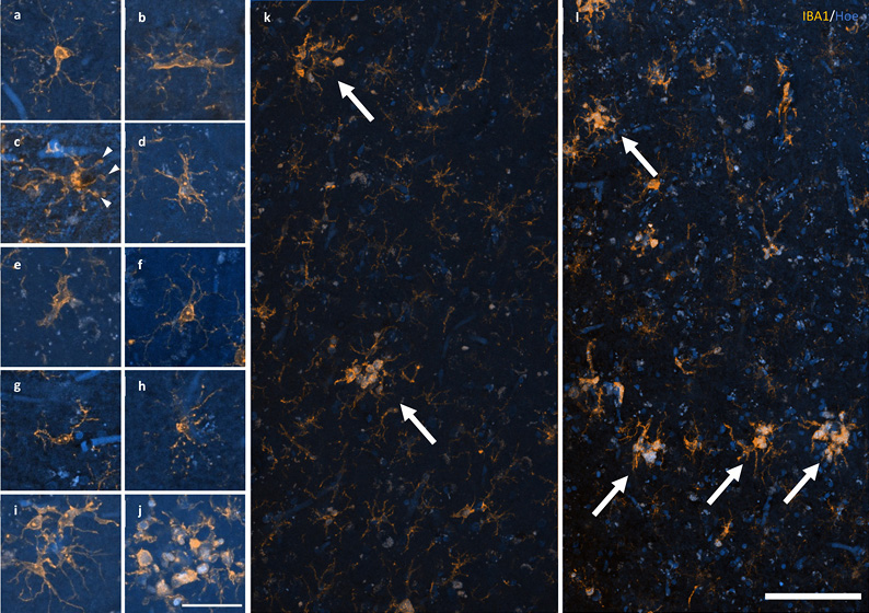 Figure 2 Response of microglia to AD pathology. a–e A spectrum of microglial activation can be identified by a series of morphological changes including an enrichment of IBA1 labelling of the soma and primary processes (a), hypertrophy of the primary processes (b), retraction of tertiary processes ± the formation of morphological features consistent with phagosomes (arrow heads) (c), further retraction of secondary processes (d), until amoeboid in shape (e). f–h Healthy ramified microglia have a small, spherical soma and thin, evenly distributed processes (f), contrasting with dystrophic microglia that have either deramified and tortuous processes (g) or pseudo-fragmentation of processes when marked with IBA1 (h). i–j Microglia that form a cluster within the boundary of an Aβ plaque may be either dystrophic or have reached a phase of early (i) or late/amoeboid (j) activation. k–l Mosaics of IBA1 staining demonstrating the size and distribution of microglial clusters (arrows), defined as three or more somata occurring within, or touch the boundaries of, a 20 μm2 virtual graticule subregion, in the PMC of an HPC (k; M23) and AD case (l; M13). Scale bar in j = 40 μm (a–j); in l = 100 μm (k–l)