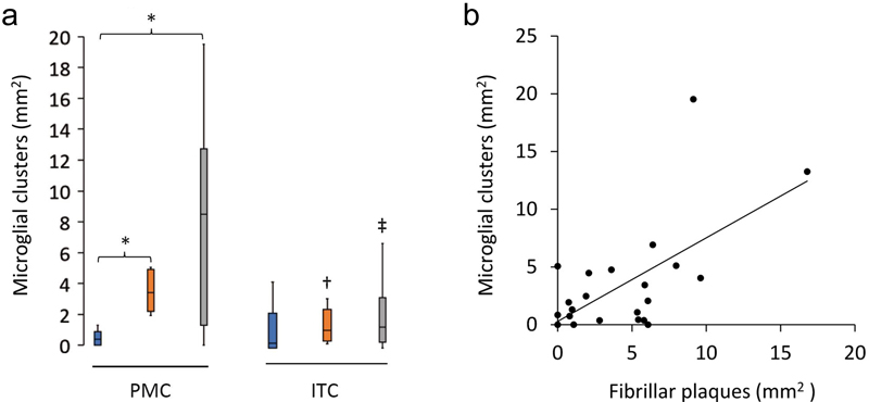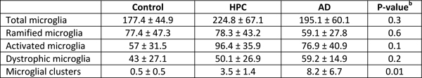 Figure 3 Characteristics of microglial clustering in the PMC. a The density of microglial clusters was significantly greater in the PMC of HPCs and AD cases compared to controls. b Microglial clusters were more frequently associated with fibrillar neuritic plaques in a combined group analysis; Spearman ρ = 0.54, p = 0.006. †Significantly reduced compared to PMC of HPCs; ‡Significantly reduced compared to PMC of AD cases. *†‡p<0.05. Table 4. Quantification of the morphological subtypes of microglia in the primary motor cortexa