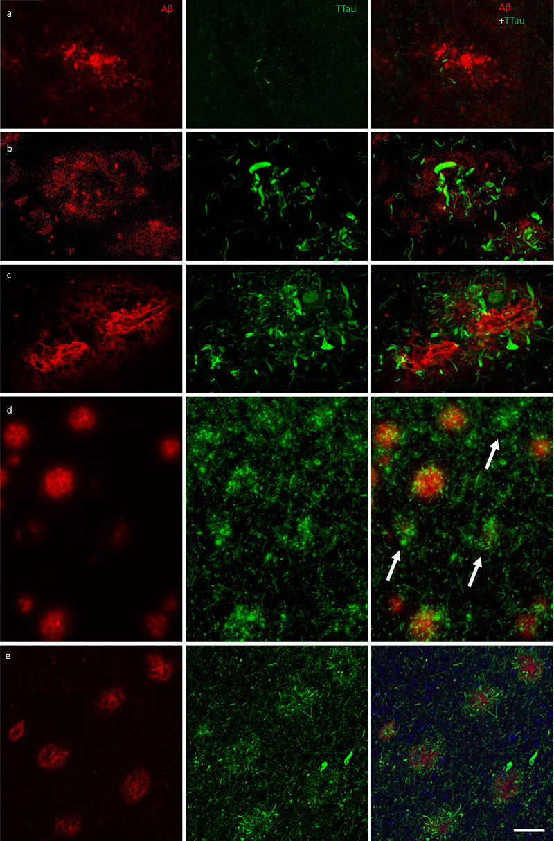 Figure 4 Immunofluorescent double-labelling for Aβ and TTau. a–c The majority of Aβ plaques examined here were associated tau-positive dystrophic neurites, with a clear gradation visible between the PMC (a) and ITC (b) in controls (M01 pictured in a and b) and AD cases (ITC of M09 pictured in c). AD cases had the most extensive build-up of DNs in fibrillar and dense-cored plaques, as well as perivascular (capillary) Aβ deposits (c). d Remnant plaques (arrows) are characterised by absent or weak Aβ staining and dense accumulations of tau pathology and were much more common in the ITC than the PMC (also seen in b). e Severely affected regions of the AD brain, such as the ITC, showed a diffuse network of elongated NTs throughout the parenchyma as well radially projecting DNs. Scale bar = 20 μm (a–c), 60 μm (d), 40 μm (e)
