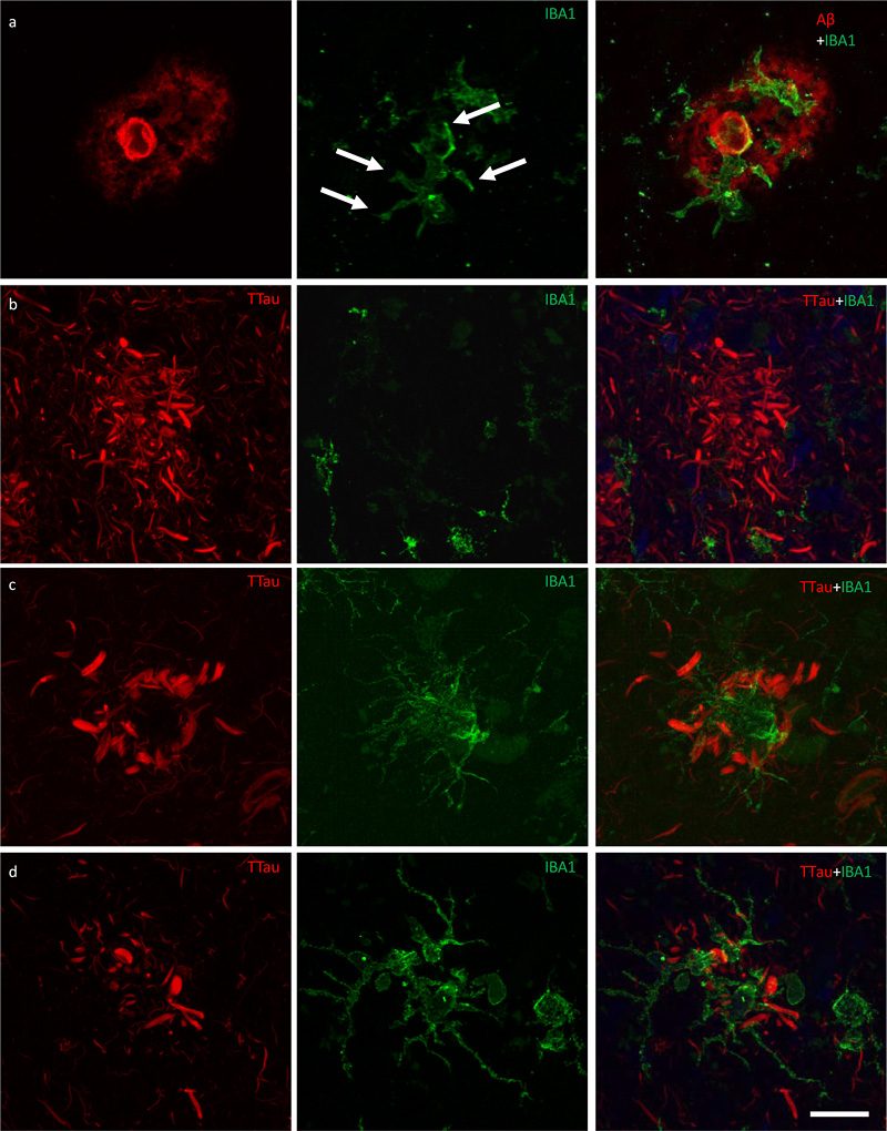 aCells/mm2; mean ± standard deviation. A graded extent of neuritic tau pathology and clustering of microglia occurs within nascent Aβ plaques, with the persistence of dystrophic neurites and the loss of IBA1-immunoreactivity and Aβ-immunoreactivity occurring in established neuritic plaques All of the Aβ plaques examined in the ITC, and a majority in the PMC, contained DNs. However, the extent of the accumulated neuritic tau pathology within each plaque was lower in the PMC (Fig. 4a) than the ITC of the same case (Fig. 4b). Both Aβ deposits and globular DNs were seen perivascularly (Fig. 4c), consistent with previous observations (39). The density of DNs was greatest in the ITC of AD cases (Fig. 4c), which also had the highest density of remnant plaques characterised by accumulations of DNs associated with weak or absent Aβ-immunoreactivity (Fig. 4d). In the ITC a diffuse lattice of elongated NTs occurred throughout the neuropil and independently of Aβ plaques (Fig. 4e). DNs appeared radially projecting from Aβ plaques (Fig. 4e) and showed either elongated or globular morphology (Fig. 5a). Hoechst dye marked cell nuclei around the periphery of Aβ plaques and also partly stained the fibrillar deposits of Aβ (Fig. 5a). Hoechst has previously been reported to stain Aβ plaques in transgenic mice (40). Immunofluorescent double-labelling showed no colocalisation of Aβ and TTau (Fig. 5b).