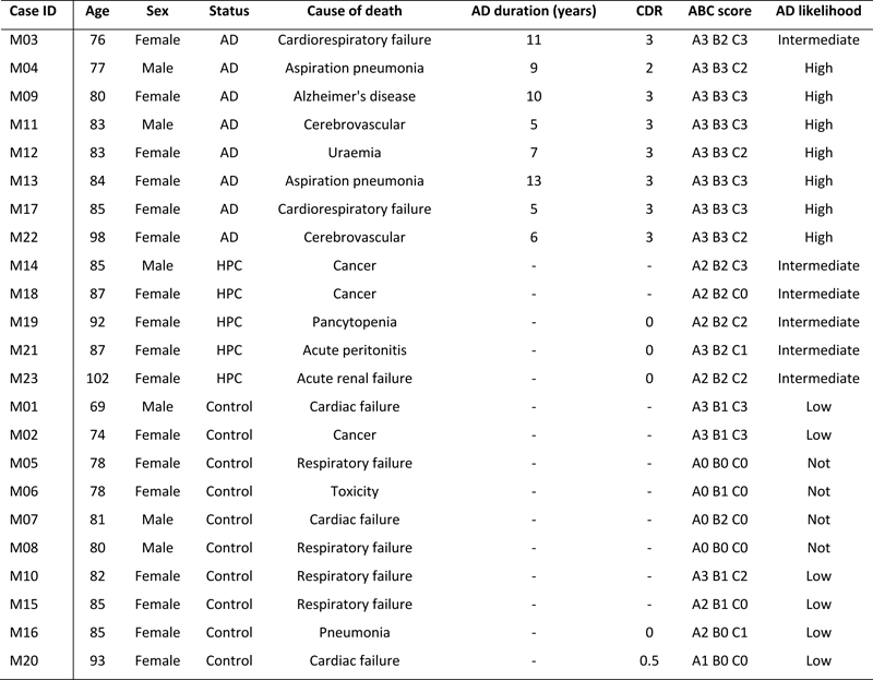 Methods This study was approved by the University of Sydney’s Human Research Ethics Committee (HREC#2015/477). All tissue samples for this study, as well as demographic and clinical information, were supplied by the New South Wales Brain Tissue Resource Centre (NSWBTRC) and the Sydney Brain Bank (SBB), collectively the New South Wales Brain Banks (NSWBB), following approval from their Scientific Advisory Committee. Methods for case ascertainment and tissue preparation by NSWBB have been previously published (35). The demographic and clinicopathological characteristics of the cohort (Table 1) and data from the ITC have been previously published (26). Immunofluorescence Immunofluorescence staining procedures were performed on free-floating 45 μm fixed sections derived from the caudal aspect of the superomedial area of the PMC of controls (n = 10), HPCs (n = 5), and pathologically confirmed AD cases (n = 8) as previously described (26). Double-labelled sections using antibodies against Aβ, total tau (TTau), and the pan-microglial marker ionised calcium-binding adapter molecule 1 (IBA1), were used for the quantification of Aβ and tau loads and microglial morphological subtypes. For Aβ and IBA1 quantification, heat-induced epitope retrieval was performed using a sodium citrate solution (pH 8.5) at 60°C overnight, followed by a 12-minute formic acid (90%) incubation at room temperature. Blocking was performed in 10% normal goat serum (Gibco #16210072), and primary (mouse Aβ, 1:1000, BioLegend 803002; rabbit IBA1, 1:1000, Wako 019-19741) and secondary (1:200; Thermo Scientific: Alexa Fluor (AF) 488 goat anti-mouse, #A11001; AF 568 goat anti-rabbit, #A11011) antibody incubations were performed at 4°C with gentle agitation. Nuclear counterstaining was performed in the last 40 minutes of the secondary antibody incubation by the addition of Hoechst 33342 dye (1 µg/mL; Thermo Scientific 62249). Sections were mounted using Prolong Diamond Antifade (Invitrogen P36961). Double-immunolabelling of TTau (rabbit; 1:500; Dako K9JA/A0024) and IBA1 (mouse; 1:50; Millipore MABN92) was carried out as previously described (34). TTau immunostaining of NFTs, NTs, and DNs has previously been demonstrated to give comparable immunostaining to standard phosphotau antibodies (12E8 and AT8) (36). Briefly, heat-retrieval was performed with sodium citrate (pH 6.0) for 10 minutes at 100°C, before permeabilising, blocking with BSA, and incubating in primary antibodies for three hours at room temperature or overnight at 4°C, and finally incubating in secondary antibodies (1:200; Invitrogen: AF555 goat anti-mouse, A214424; AF647 goat anti-rabbit, A21244). Hoechst 33342 was added to counterstain nuclei and sections were mounted in ProLong Gold Antifade. Image acquisition and analysis Aβ and IBA1 double-labelled sections were imaged using a Zeiss LSM 800 confocal microscope using the ‘tile scan’ function at the Advanced Microscopy Facility, Bosch Institute, The University of Sydney. A previously validated modified disector sampling approach that utilises one section per individual was used here for the analysis of the Aβ and IBA1 immunostained sections (37). Briefly, a total of three cortical strips per section from areas where the pial surface and the grey-white boundary were strictly in parallel were acquired for the quantification of microglia, Aβ plaques and Aβ-positive pixels. These cortical strips were constructed of serial images 500 μm in width, 6 μm in z-depth with three z-slices (z-step = 3 μm), spanning all of the cortical laminae of the PMC using a 20×/0.8 numerical aperture (NA) objective. Clusters of microglia and individual microglia, which were categorised as having either a ramified, activated, or dystrophic morphology as previously described (26), were enumerated in image analysis software (Fiji; NIH). The terminology used to describe the different populations of morphologically diverse populations of microglia was informed by previous investigations (25, 28, 30). Microglia with thin, highly branched processes, and a spherical nucleus were categorised as ‘Ramified’. ‘Activated’ microglia (previously termed ‘deramified’ (34)) included those cells that displayed hypertrophy of the soma or processes with retraction of secondary or tertiary processes. ‘Dystrophic microglia’ were identified on the basis of a loss of processes with the remaining processes displaying significant tortuosities or discontinuous IBA1-immunolabelling with or without blebbing or punctate IBA1-labelling (previously dystrophic microglia were subcategorised as either ‘punctate’ or ‘discontinuous’ to reflect these observations (34)). A ‘Cluster of microglia’ was counted if three or more soma occurred within, or were touching the margins of, a 20 μm2 virtual graticule subregion. Larger clusters were counted as one cluster if the graticule subregion could be moved and still incorporate at least three somata. Clusters were counted whilst visualising only the 568 nm (IBA1-positive) channel to distinguish these from individual microglia and to minimise potential false-positive counts in the presence of either Aβ- or TTau-immunostaining. The total number of microglia counted per section averaged 519 with a coefficient of error (CE) of ≤0.2 for all counts of morphological subtypes, with the exception of microglial clusters (CE ≤0.3) which were relatively rare and displayed significant variance between cases. Quantification of TTau was carried out using an Olympus VS120 slide scanner at the Sydney Microscopy and Microanalysis, Brain and Mind Centre, The University of Sydney. Whole section DIC and fluorescence overviews of a single section from each case were generated using a 10× objective and were used to systematically map out four representative 500 μm2 regions of interest (= 1mm2 per section) within the mid-cortical laminae (III-V) for manual counts of NFTs and for the quantification of T