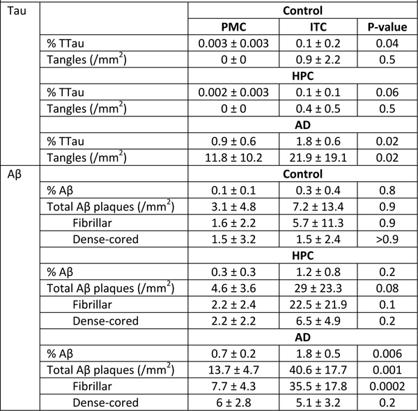 aMean ± standard deviation. Table 3. Regional neuropathological comparisonsa