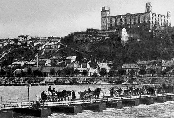 Fig. 1. Bratislava, 1945 source: TASR archive In my mentioned text Conversation with the Moon I embedded all my youthful, naive thoughts and emotions from that time. This was in Hungary in the early fifties under the Rákosi dictatorship. After finishing that story I realized it couldn’t go on like this for long. There was a feeling of looming threat that made my stomach hurt. And now I just had to decide what profession to choose for further learning. Both my mother and grandfather were physicians and it became obvious that I, too, would choose this apolitical, strictly fact-based profession, although it felt quite distant for me. My paternal grandfather, Gyula Garzuly, was a ship's captain, he also sailed around the World. Later in Bratislava (Preßburg, Pozsony), when it was still a Hungarian city, he became the supervisor of the vessels of the Hungarian River and Shipping Company. In 1916 he received a major award, the Silver Degree of the Civil Military Cross of Merit – ships on the Danube also took part in the events of the First World War. With this, he earned to be imprisoned in Ilava in 1918. He died shortly after his release, I didn’t even know him. My other grandfather, Dr. Rezső Limbacher, the son of a blacksmith in an earldom, was such a skillful blacksmith „assistant” that the count taught him. Graduated from University, he became a recognized obstetrician-gynecologist in Bratislava (Preßburg, Pozsony). The first postmortem sectio cesarea in the city was performed by him, an article about this case appeared in the Hungarian Medical Weekly. His son, Rezső Peéry, as a journalist and writer, was one of those who held the soul with his articles in the Hungarians of Bratislava after the Treaty of Trianon.