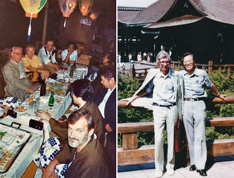 Fig. 11. Congress of Neuropathology in Kyoto, 1990. On the left foto: Franz Seitelberger, his wife and Hans Lassmann left, right one of my friends, Herbert Budka. On the right foto: Riki Okeda (Tokyo Medical and Dental University), my other friend and I I visited Professor Kurt Jellinger and later his successor, Professor Herbert Budka, and his doctors, first of all Ellen Gelpi, Romana Höftberger and later Gábor G. Kovács with special and rare cases: these meetings also resulted in publications (2-17). Neuropathological diagnosis of diseases was a difficult task, especially for the deceased ones at the Pediatric Department. There has been almost no information or descriptions about the neuropathological abnormalities caused by these diseases, so it was worth dealing with them. We were able to diagnose some of these clinically – just like the family with the Lowe-Syndrome (2) – but e. g. the disease underlying symmetrical cerebral heterotopias and strange knee calcifications – the Zellweger-Syndrome (3) – was recognized by Kurt Jellinger. Adult cases were also usually limited to rare diseases such as the Foix-Alajouanine disease (4), or the Jakob-Creutzfeldt disease (5). Efforts to diagnose an undiagnosable disease Of the many rare and interesting cases I have encountered, I would like to highlight only two. In the first, the story began when one of our female hospital assistants became disoriented for half an hour, later not remembering it. We found strange calcification along the Sylvian-fissures on the CT scans. The total protein content of the CSF was extremely high. The cause of the global transient amnesia was not found. Later, it occurred to me that I had seen a similar CT scan from a female patient with suspected multiple sclerosis three years earlier. We have found this recording and it turned out, that this patient also had a very high CSF total protein. And we discovered – quite by accident – that these two patients were related to each other, cousins. We mapped the whole family. Many years ago, two men from this family passed away at our department: before that, they visited the department many times because of their central nervous system symptoms (migraine like headache, transient global amnesia, nystagmus, spastic paresis, ataxia, hearing loss, incipient dementia). We found the paraffin blocks of the deceased (but only blocks made from the brain). Examination of the histological specimens revealed that amyloid was deposited in the central nervous system, primarily subpial. The area next to the deposited amyloid was calcified. It became apparent that these calcifications could be seen on the CT scans. None of the patients had any peripheral nervous system symptoms. However, neither the symptoms, nor the high protein content of the CSF was consistent with any of the known central nervous system amyloidoses. And then, one of the two mentioned female patients passed away. After talking to the family, the deceased was brought to the hospital by ambulance and an autopsy was made. It turned out that although the patient had no symptoms of involvement according to the other organs – apart from central nervous system abnormalities – amyloid was found in small amounts in the kidneys, heart, and liver. So the autopsy referred to systemic amyloidosis. But our cases could not be classified here either. Our cases were very similar to the very rare, so-called oculoleptomeningeal amyloidosis cases, but the patients had no visual impairment. Consultations again and again (Neurological Institute, University of Vienna, Max-Planck-Institut für Biochemie, Martinsried, Departments of Pathology and Neurology, New York University Medical Center), immunohistochemical and molecular biological studies revealed a completely unexpected result: the disease was caused by a transthyretin mutation. We summarized findings in our article (authored by Vidal R, Garzuly F, Budka H, Lalowski M, Linke RP, Brittig F, Frangione B, Wisniewski T) in the American Journal of Pathology in 1996 as follows: We describe a novel transthyretin mutation at codon 18 where Asp is replaced by Gly (D18G) in a Hungarian kindred. This mutation is associated with meningocerebrovascular amyloidosis. Fifty different transthyretin mutations are related to amyloid deposition, typically producing a peripheral neuropathy or cardiac dysfunction… With this report we establish that transthyretin amyloid deposition can also produce central nervous system dysfunction as the major clinical symptom (7).