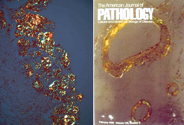 Fig. 12. Amyloid showing birefringence and the cover of Am J Pathol with an image from our case In the Journal Neurology, the patient's clinical symptoms were summarized, naming the disease Hungarian type amyloidosis (8). In this form of familiar amyloidosis, the pathological mutant is produced in large amount in the plexus choroideus and – upon entry into the CSF – immediately precipitates on the membranes, ependymes, unlike to forms that cause peripheral neuropathy, where mutants remain in the blood (9). Now we know that the so-called oculoleptomeningeal amyloidoses are also caused by transthyretin mutations. Unfortunately, these "cerebral" forms of amyloidoses are not yet curable, although our Neurology Department has just admitted the next sick member of our family. Establishment of the Hungarian Society of Clinical Neurogenetics, Szombathely, 1997 Five years of efforts made clear to me, that underneath the layer of neuropathology stretches another layer, clinging to it: the neurogenetics of diseases. Without any knowledge of this area, we cannot treat the hereditary diseases. Without any molecular-biological tests, we can do essentially nothing for diagnosing or researching them, and the key to curing these diseases is also buried here. The recognition that neurogenetics will have a significant development and that the work in Hungary should be coordinated, was also evident to other neurologists and neuropathologists. As a result of the joint efforts, we held the first scientific meeting on neurogenetics in Hungary: with a significant number of foreign participants, it took place in Szombathely on May 9–10, 1997. Among the foreign professors of the gathering were George Karpati, Kurt Jellinger, Herbert Budka, Parviz Mehraein, Hans (Hano) Bernheimer, Jean Bénard, Manuel B. Graeber. The event had a lot of Hungarian participants. Professors Ferenc Mechler and Mária Judit Molnár from the Clinic of Neurology in Debrecen also participated at the meeting. They suggested the establishment of the Hungarian Society of Clinical Neurogenetics.