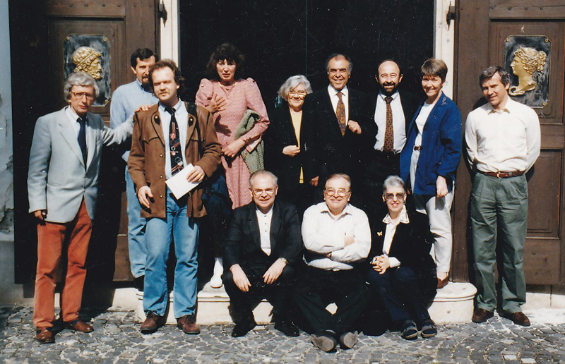 Fig. 13. A group of participants of the first scientific meeting on neurogenetics in Hungary. Standing row from right: Gábor Kiss, Jean Bénard and wife, Parviz Mehraein and wife, Maria Geszler, Sámuel Komoly, in front of them Manuel B. Graeber and I, George Karpati and wife and Miklós Wenczl are sitting. To this day, the Society diligently holds annual scientific meetings and looks to a prosperous future. At the tenth anniversary gathering of the Society, Professor Ferenc Mechler and I had the honor to become life members of the association. However, it took more than twenty years to wait for an excellent neurologist and researcher, Professor Bernadette Kálmán – who has spent several decades in the United States – to establish a molecular pathology laboratory at the Markusovszky Hospital. The other interesting disease was a variant of the autosomal dominantly inherited Fabry disease. A patient – who suddenly became unconscious – was brought to our Department in the evening. Angiography was performed, the images showed an extremely wide basilar artery – a so called megadolichobasilar artery – which was thrombosed. The next morning, during the visit, I lifted the patient's quilt. And then I saw on the skin of the abdomen the characteristic angiokeratomas of Fabry disease. I recognized it immediately, because three years ago I saw a similar patient. It was later revealed that the patient seen three years ago was the same. The patient was expected to die within a few days. I called Maria Mázló, the head of the Electron Microscope Laboratory, of the National Institute of Psychiatry and Neurology in Budapest. She said, the investigation would be carried out, but asked us to send fresh samples to the laboratory. I discussed the immediate autopsy with the head physician of our Pathological Department. The patient died at one o'clock at night. After the obligatory two-hour wait we were standing in the autopsy room, and the autopsy was done at three o'clock. This was the first autopsy in Hungary by a patient who died of Fabry disease, no previous reports were found. And we believe it was also the first autopsy at night in our country.