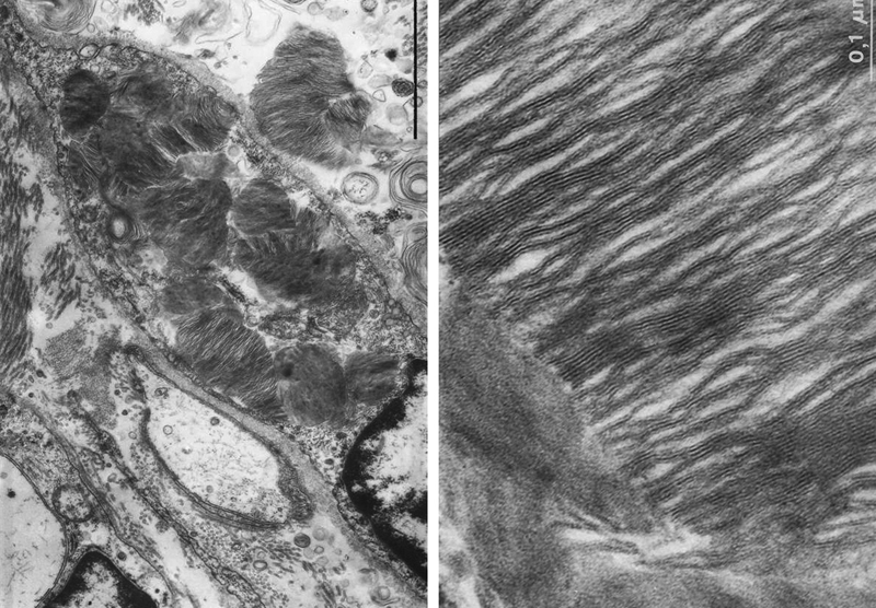 Fig. 14. Electron microscopic image of the stored material of our patient with Fabry’s disease Three years later, a similar case occurred in a neighboring town's hospital: a thrombotized giant basilar artery caused death. We received the formalin-fixed material samples. The lesions were completely similar to our case. And within a short time it turned out that the two patients were related to each other. These cases were also discussed with the colleagues in Vienna, meanwhile the molecular pathological examinations were completed at the University of Debrecen. The cases were published in the Brain with the following title: Megadolichobasilar Anomaly With Thrombosis in a Family With Fabry's Disease and a Novel Mutation in the Alpha-Galactosidase A Gene (11). Shortly after the publication, it became possible to treat Fabry-patients, and some of the family members may already be happy with this opportunity. Changing times – changing diseases n 2014, our neuropathology laboratory turned 50 years old. On the occasion of the anniversary we published an article in the medical journal Orvosi Hetilap (18). Nearly 5500 autopsy examinations were carried out during the preceding 50 years. The documentation reflects on variations in the occurrence of diseases, and it draws attention to those disorders, which can be prevented or treated today, but may represent diagnostic challenges. Measles-related subacute sclerosing panencephalitis caused death in 13 cases, the last occurred in 1991. The mandatory vaccination against the causative morbilli virus has eliminated this severe neurological complication. Fourteen lives were lost due to herpes simplex encephalitis, including the last case that occurred in 1999. Feasibility of early diagnosis and the availability of acyclovir therapy resulted in better outcome without fatality. Tuberculous meningitis still occurred in most recent years, although only sporadically. Recognition of this condition is not straightforward due to its rarity, considerations for this disease are often omitted from the routine differential diagnosis. The low mortality rates in tick-borne encephalitis dropped further after the introduction of vaccination, 8 cases were documented altogether. With our colleagues in Vienna, we published two reports on tick-borne encephalitis (12, 13). The last fatal cases of neurolues were seen in the 1990s. However, syphilis itself has not disappeared, and the number of cases with newly acquired infection continues to rise. Meningosis leukaemica caused the death of 20 patients, mainly children, between 1972 and 1987. It was a sad time for me to witness this as a neurologist. I wrote also my PhD dissertation on Neuropathological features of leukemias and lymphomas. Introduction of intrathecal methotrexate and radiation therapy made the prevention and effective treatment of meningosis leukaemica possible (19, 20). However, a careful coordination of these treatment's modalities is important as nervous system complications may develop in the form of disseminated necrotizing (Methotrexate) leukoencephalopathy. We had four such cases, we needed Professor Herbert Budka’s help to diagnose the first one. Fifty years is a long time, many things have happened apart from the events in the neuropathology laboratory. I would like to highlight two of these. In the 1980s, the rehabilitation of neurological patients had an increasing emphasis. This was the beginning of the golden era of neurorehabilitation – not only of neuropathology as Herbert Budka referred to in his recently published Reflections (21). In Szentgotthárd – a town next to us – a large rehabilitation hospital was established on the site of a former pulmonology sanatorium. Together with the hospital's director we visited similar institutes in Austria. We contacted Professor Gerhard Barolin, who was the main organizer of the neurological patients' rehabilitation in Austria. My friend divided his rehabilitation hospital into three parts and reserved one for neurorehabilitation. In 1988, we organized a two-day scientific meeting on neurorehabilitation entitled Current Issues in Neurorehabilitation, with guest participation of Austria, Switzerland and Germany. In a similar form, the gathering was repeated in 1993. These were the first events in Hungary dealing exclusively with neurorehabilitation. Maria Geszler's ceramic exhibition in the Picture Galery and the scientific meeting on neurorehabilitation opened at the same day, one after the another in 1993.
