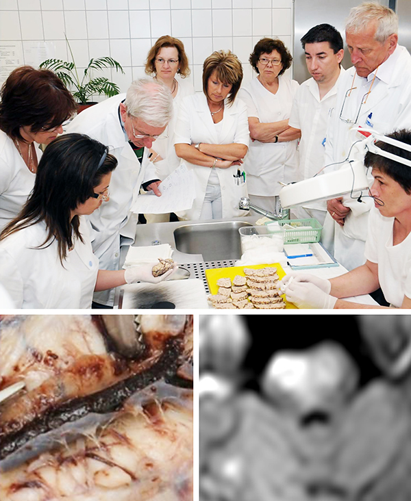 Fig. 17. Thrombosis of the basilar artery in a young woman. Comparison of the pathological with the radiological findings. The Department of Pathology organized the clinico-pathological conferences since the early 1950s. These were implemented on a Soviet model. Professor Pavel Ivanovich Sapochkov said at that time: I work at Clinic No. I in Moscow and our clinic is extremely restless (sic) when it comes to the patient’s autopsy. Pathology examines the relationship between clinical and pathological diagnosis the most accurate way. Every two weeks the doctors are called together and the diagnostic differences in each case are talked over, and it’s a shame (sic) for a doctor to be invited to such a hearing, where his fault is discussed. After moving on to the Pathology, I was entrusted with organizing these conferences, every three months, with mandatory attendance for hospital physicians. It became clear that the handling of these cases – where an error has occurred – falls within the competence of other forums. We expanded the discussions of cases by talking not only about the deceased ones, but also the healed patients. The conferences no longer featured the doctors who worked poorly, but those who worked well. And we gradually set the focus of the conference on cases that were interesting in some way, predominantly discussing rare diseases.