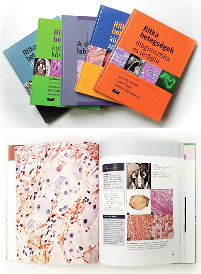 Fig. 18. Our books about rare diseases The Pathology Department offers a very good angle to observe to the medical activities of our very large hospital and it is easy to discover interesting cases. Over the past nearly twenty years, we have written five books about rare diseases relying on these cases (the sixth one is also in progress) with lots of coloured illustrations. Professor Romhányi said: One case is not a case. But we relied on 260 cases to present the rare diseases – with the required information and notes – we have experienced during our work. And in addition, at the hospital's lecture hall was named after Professor Romhányi.