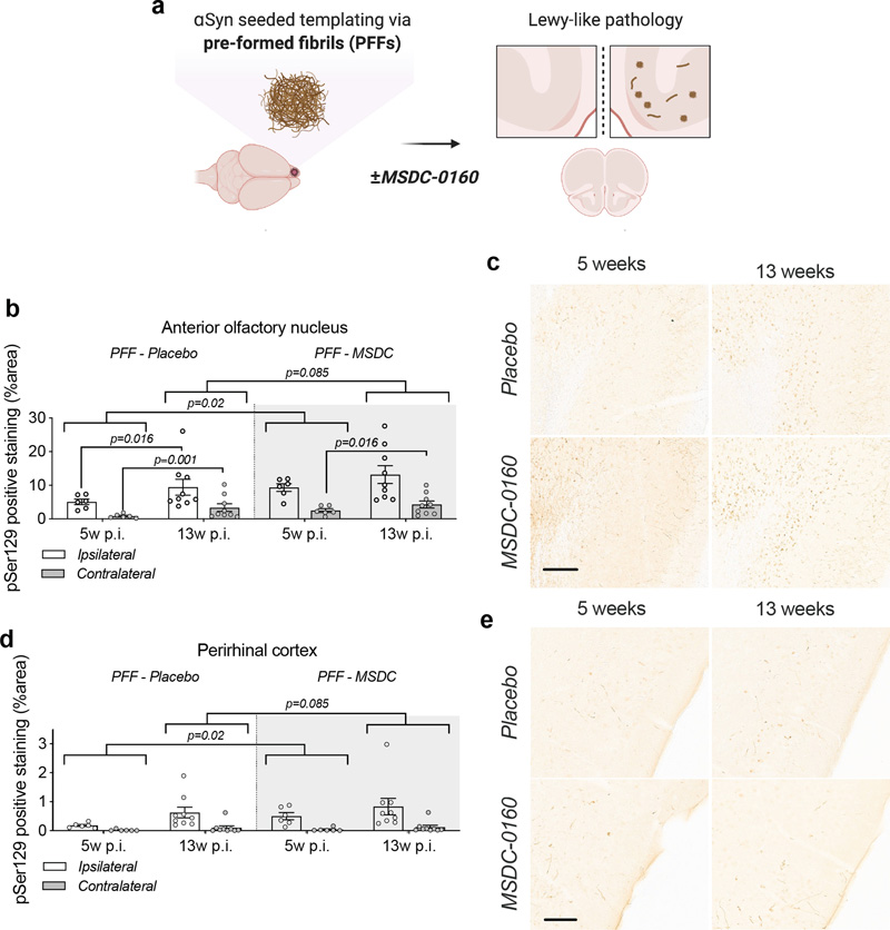 Figure 6. A metabolic switch increases αSyn pathology load and propagation in mouse AON and PRh. a) Experimental timeline; at 12 weeks of age C57BL/6J mice were injected with PFFs or PBS and starting at one-week post-surgery they had free access to MSDC-0160 or placebo containing chow until the 5- or 13-week endpoint. Quantification of αSyn pSer129 positive signal in b) the AON and c) the PRh after 5 or 13 weeks of MSDC-0160 or placebo treatment. MSDC-0160 treated mice had significantly more αSyn pSer129 positive stain at 5 weeks post-surgery than the placebo group (1.8 times more; p=0.02, 95% CI 1.176 - 2.824, Beta mixed-effects regression). There is also weak evidence that this persists at the 13-week timepoint (p=0.085, 95% CI 0.986-1.92, Beta mixed-effects regression). c) Quantification of αSyn pSer129 positive signal in the PRh after one and three months of MSDC-0160 or placebo treatment. d) Representative images of αSyn pSer129 staining in d) the ipsilateral AON (scalebar = 130 μm) and e) the PRh (scalebar = 100 μm). Unilateral PFF injections have previously been shown to impair olfactory function in mice20. Olfactory function was thus examined 13 weeks post-surgery using the buried pellet test. No significant difference was observed between the PBS and PFF groups, regardless of whether the mice had been treated with placebo or MSDC-0160 (Supplementary fig. 6A). When assessing the total number of NeuN and CV-positive cells in the AON 13 weeks post-surgery via stereological quantification, we found no significant differences between any of the experimental groups (Supplementary fig. 6B & C). Immunohistological assessment at 5- and 13-weeks post-surgery revealed a significantly higher percentage area containing pathological αSyn (αSyn pSer129) in the AON than the PRh, regardless of time point and treatment group (8.5-16 times higher; all p ≤ 0.001) (Fig. 6B-E). The same was seen for the ipsilateral side compared to the contralateral side (65-78% less on the contralateral side; p ≤ 0.001). From 5 to 13 weeks post-surgery, αSyn pSer129 increased significantly for MSDC-0160 and placebo treated animals, which both gained ~99.2% and 163.2% of their αSyn pSer129 immunopositively stained area from week 5 to week 13, respectively in the contralateral AON (p = 0.016 and < 0.001, respectively, 95% CI = 19.2 - 233.3 and 55.8 - 344.4). In addition, placebo-treated animals had a significant increase of pathology in the ipsilateral AON from the 5 to 13-week timepoint (p=0.016, 95% CI 18.3% - 200%). This was not observed for MSDC-0160 treated mice. When comparing treatment groups, MSDC-0160 treated mice had significantly more pSer129 positive signal at 5 weeks post-surgery than the placebo group (1.8 times more; p=0.02 95% CI 1.16 - 2.90). There is also weak evidence that this persists at the 13-week timepoint (p=0.085, 95% CI 0.98-1.95). No ni-αSyn was detected in the PFF seeding model at the 13-week timepoint (Supplementary fig. 7). For detection of potential amyloid (β-sheet rich) structures in the PFF seeding model and the AAV overexpression model, we used a luminescent conjugated oligothiophene (LCO). LCOs are small molecules with a flexible thiophene backbone that upon binding to amyloid structures become fluorescent21. One such LCO, which has previously been shown to bind aggregates in tissue samples from patients suffering from systemic amyloidosis, as well as a variety of other disease-associated protein aggregates, is h-FTAA21 In the AON at 13 weeks post-surgery we observed ring-like h-FTAA positive structures (Fig. 7) in the PFF model. These overlapped with αSyn pSer129 antibody staining, indicating that the αSyn pathology detected in this model is β-sheet rich with amyloid properties. On the contrary, we did not find a h-FTAA positive signal in the αSyn high group for the AAV overexpression model. This highlights differences in αSyn assembly states several weeks after surgery in the two PD rodent models.