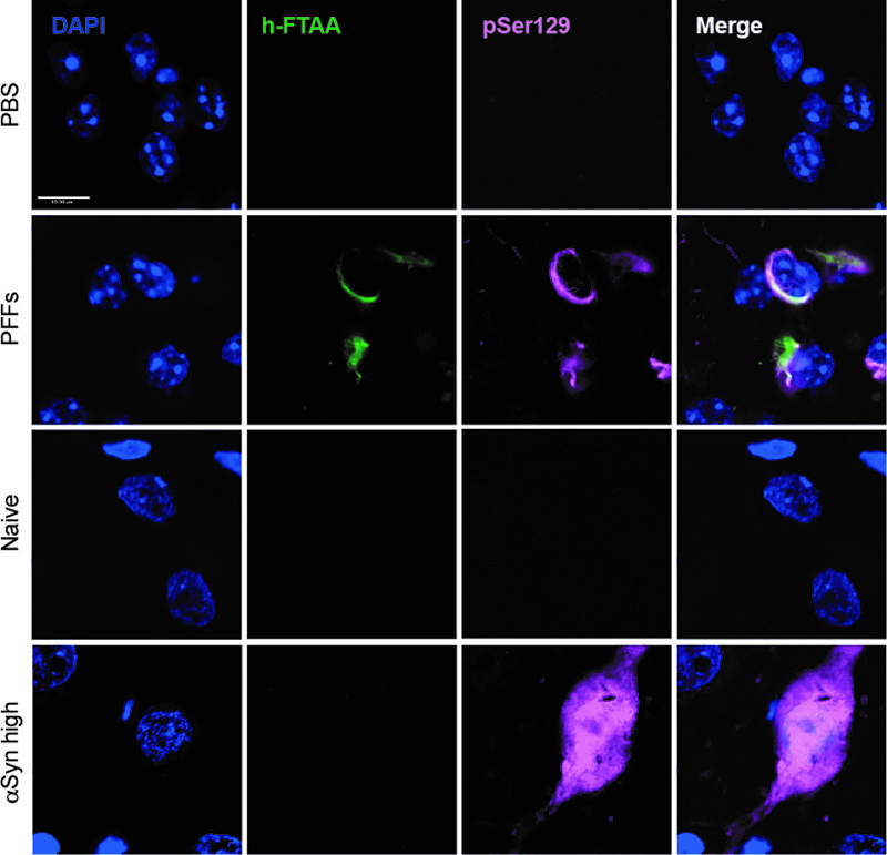 Figure 7. h-FTAA positive protein aggregates detected in the PFF seeding model but not the AAV overexpression model. Representative images of the AON and the SN for the PFF model and the AAV overexpression model, respectively. The h-FTAA positive signal (green) detected in the AON 13 weeks following surgery co-localizes with the αSyn pSer129 signal (pink). DAPI was used to visualize the cell nuclei (blue), scale bar = 10 μm and 3 animals per group were analyzed. Given the absence of any therapeutic benefits in the PFF model, we again investigated the presence of inflammation via measuring the hydraulic radius (area/perimeter ratio) of microglia in the AON 13 weeks post-surgery. When we compared the injected side with the non-injected side, we found no significant change in microglia morphology (Fig. 8A, B). Furthermore, we did not detect any significant difference between PBS and PFFs groups or differences between animals treated with placebo or MSDC-0160. In addition, by quantifying LAMP2-positive staining we do not observe any lysosomal deficits in the AON 13 weeks post-surgery (Fig. 8C, D). Taken together, in absence of lysosomal deficits and microglial changes, a metabolic switch, by inhibiting the MPC, does not reduce accumulation of αSyn pSer129 in mice injected with PFFs in the olfactory bulb.