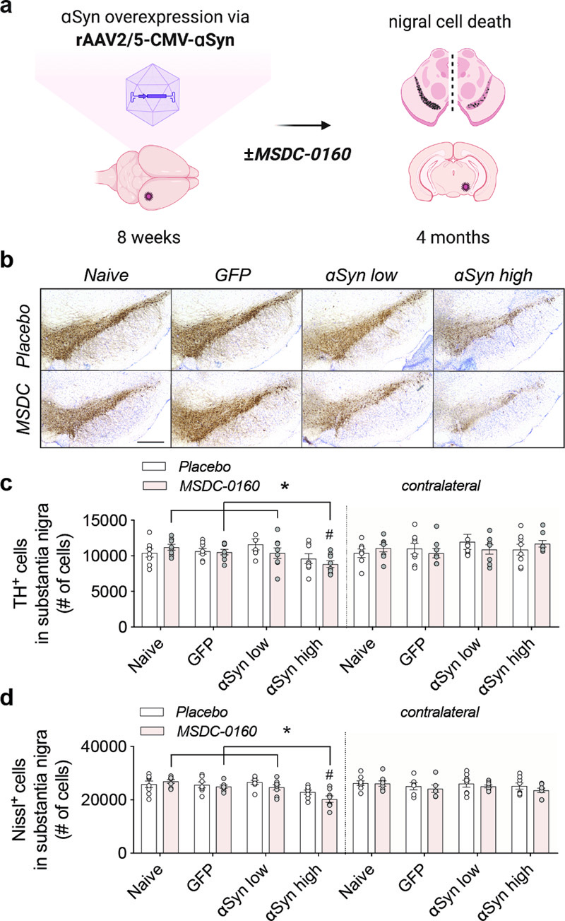 Fig 1. MSDC-0160 treatment does not influence nigral dopaminergic cell viability in a progressive αSyn overexpression model. a) Experimental overview of the αSyn viral vector overexpression model in rat SN. b) TH expression and Nissl+ cells in rat SN for animals treated with placebo or MSDC-0160 in control or experimental conditions. Scale bar = 500 μm. c) Stereological quantification of total dopamine neurons in rat SNpc for ipsi- and contralateral sides. The contralateral hemisphere had significantly more TH cells than the ipsilateral in the αSyn high mice (p = 0.001, ~22.5% more cells CI = 10.3% - 36.0%, negative binomial mixed-effect model, n = 8, s.e.m.). In the ipsilateral side, αSyn high had significantly fewer TH cells than Naïve, GFP and αSyn low (p = 0.031, 14.9% fewer CI = 4.8 – 23.9, *p = 0.05, 13.4% fewer 95% CI 3.1 - 22.6 and p = 0.0313, 15.6% fewer CI = 24.5- 5.6, respectively, negative binomial mixed-effect model, n = 8, SEM). d) Stereological quantification of Nissl+ cells in rat SN for ipsi- and contralateral sides. For the αSyn high group, the ipsilateral side has ~ 13% fewer Nissl+ cells across both treatment groups than the contralateral (p < 0.0001, 95% CI 6.4 - 20.1, negative binomial mixed-effect model, n = 8, SEM). αSyn high shows significantly fewer Nissl+ cells compared to animals injected with naive, GFP, or low amounts of αSyn (p < 0.001 for all 3, GFP: 15% fewer CI = 8% - 21%, Naive: 18.4% fewer CI = 12.0% - 24.4%, αSyn low: 16% fewer CI = 22.2% - 9.3%, negative binomial mixed-effect model, n = 8, SEM). Female rats were stereotactically injected in SNpc at 8 weeks of age with rAAV2/5 CMV-Syn-αSyn or rAAV2/5 CMV-Syn-GFP expressing vector that served as a control (Fig. 1A). One week post-surgery, the animals were allowed free access to chow containing either MSDC-0160 (30mg/kg) or placebo for four months. In order to evaluate the uptake and distribution of MSDC-0160, we analyzed the levels of exposure of MSDC-0160, pioglitazone and its metabolites in rat plasma, CSF and brain mitochondria 20 hours after administration (Supplementary fig. 1). Hydroxymitoglitazone, the active metabolite of MSDC-0160, was found at higher levels, compared to pioglitazone metabolites, in plasma and CSF. In brain mitochondria hydroxymitoglitazone was also found at higher levels then pioglitazone-OH or other metabolites, showing its interaction with brain mitochondria but also suggesting that the interaction of MSDC-0160 metabolites with mitochondria is stronger compared to pioglitazone metabolites (Supplementary fig. 1). During the time of chow administration, we did not observe any differences in animal body weight or chow consumption (Supplementary fig. 2A, B). At the four-month timepoint, plasma was collected and the presence of hydroxymitoglitazone (MSDC-0160 metabolite) was quantified (Supplementary fig. 2C), showing the presence and metabolization of MSDC-0160 at expected levels. Motor behavior was examined four months after viral transduction using the cylinder test. No difference in motor behavior was apparent between any of the experimental groups, nor did we observe any statistically significant differences between placebo or MSDC-0160 treated groups (Supplementary fig. 3). When assessing the total number of TH- and Nissl-positive neurons in the SN via stereology we find a significant decrease in TH- and Nissl-positive cells between the αSyn high group and all other experimental treatment groups (Fig. 1A-B), suggesting dose-dependent neurotoxic effects of αSyn expression. No cell loss was observed in the GFP group, showing that no toxic effects are due to the viral vector itself. In addition, when the SNpc is separately analyzed for its anterior (Bregma -4.8 mm) and posterior (Bregma -6.2 mm) areas, TH loss in the anterior is much more significant compared to the posterior region (Supplementary fig. 4 A-D). This indicates that αSyn expression from the overexpressing αSyn vector is higher in the anterior SNpc since it is adjacent to the injection site, and lower in the posterior portion, which again confirms vector-driven αSyn neurotoxic effects with no neurotoxicity observed for the GFP control group. Next, we performed stereological counts of nigral cells positive for phosphorylated αSyn (αSyn pSer129) (Fig. 2A). Unexpectedly, in the αSyn low group, animals treated with MSDC-0160 show significantly more αSyn pSer129+ cells compared to the placebo group (12132 versus 7918 cells, **p = 0.002, negative binomial regression with Benjamini-Hochberg multiple testing adjustments, SEM, n = 8) (Fig. 2B). No significant effect was detected in the αSyn high group between MSDC-0160 and the placebo group.