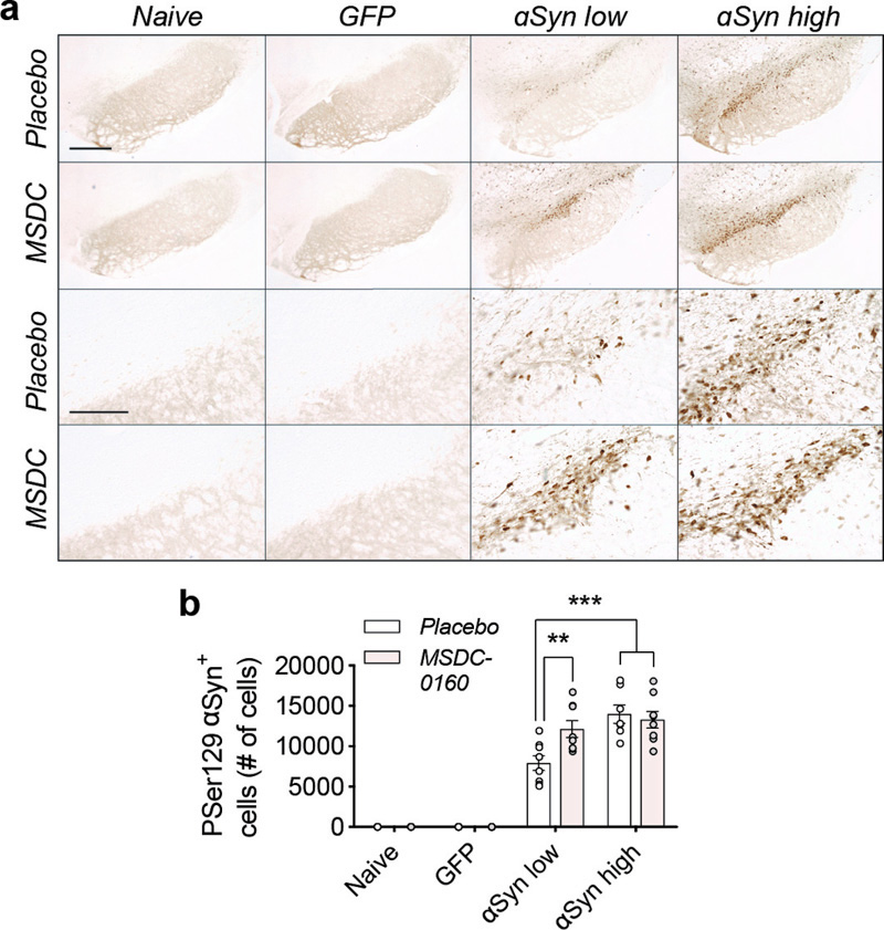 Figure 2. A metabolic switch leads to increased αSyn pathology in rat SN. a) Overview of pSer129-αSyn positive cells in rat SN. Scale bars for higher and lower magnification represents 450 μm and 100 μm, respectively. b) Stereological quantification of αSyn pSer129 positive cells in rat SN. Treatment with MSDC-0160 leads to a significant increase in phosphorylated cells in the αSyn low group compared to placebo (n = 8, SEM, **p < 0.01 and ***p < 0.001, negative binomial regression with Benjamini-Hochberg multiple testing adjustments, SEM, n = 8)). We further analyzed phosphorylated levels of αSyn via biochemical analyses and found that both soluble αSyn pSer129 as well as 1% sarkosyl insoluble αSyn pSer129 (1% P129-αSyn) are increased in the MSDC-0160 treated animals compared to the placebo group (*p = 0.046, 95% CI 0.039 – 0.471, square-root linear regression, SEM, n = 6 for soluble αSyn pSer129 and *p = 0.013, 95% CI 0.129 – 0.691, square-root linear regression, SEM, n = 6 for 1% sarkosyl insoluble αSyn pSer129) (Fig. 3E, F). This increase was observed in the αSyn high group between MSDC-0160 and placebo animals whereas a similar trend was noticeable in the αSyn low group between treatment conditions (Fig. 3E, F). This indicates that administration of MSDC-0160 results in increased αSyn aggregation in the slowly progressing viral vector-based model that overexpresses αSyn.