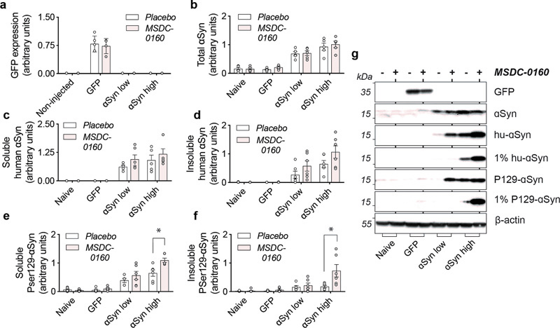 Figure 3. αSyn aggregation is increased in rat SN after inhibition of the MPC. a) Inhibition of the MPC has no effect on viral vector-mediated expression of GFP. b) Detection of total levels of αSyn in naïve and experimental conditions. αSyn overexpression leads to a 4- and 6-fold increase in αSyn low and high conditions compared to naïve rats. c,d) Isolation of sequentially extracted soluble and 1% sarkosyl insoluble human αSyn (1% hu-αSyn) shows no significant differences in aggregated αSyn after treatment with MSDC-0160. e,f) Inhibition of MPC leads to significantly increased levels of soluble and 1% sarkosyl insoluble αSyn pSer129 (1% P129-αSyn) in the αSyn high group (n = 6, SEM, *p < 0.05 square-root linear regression, SEM, n = 6). g) Representative Western Blot figures for different conditions tested. αSyn has been shown to bind the membrane of mitochondria17. Due to its membrane curvature and the presence of the negatively charged cardiolipin in the mitochondrial outer membrane, αSyn has a strong binding affinity for mitochondria18. Aggregated αSyn can disrupt mitochondrial membrane integrity and lead to toxicity19. To examine why inhibiting the MPC results in more αSyn aggregation, we investigated if altering mitochondrial function, or changing oxidative environment via MSDC-0160 affects αSyn binding or αSyn oxidation status. Stereological quantifications of the SNpc for nitrated ni-αSyn (ni-αSyn) shows that in the αSyn low group, inhibiting the MPC with MSDC-0160 leads to more ni-αSyn (*p = 0.021, 95% CI 11.5% – 111.7% more after negative binomial regression with Benjamini-Hochberg multiple testing adjustments), indicating that inhibiting the MPC leads to increased oxidation of αSyn (Fig. 4). Since it has been shown that oxidation of αSyn can affect αSyn aggregation, it raises the possibility that in this αSyn overexpression model a metabolic switch promotes the formation of insoluble assemblies of αSyn by increasing αSyn oxidation.