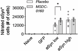Figure 4. Ni-αSyn increases upon MSDC-0160 treatment. Stereological quantification of ni-αSyn positive cells in rat SN. Treatment with MSDC-0160 leads to a significant increase in nitrated cells in the αSyn low group compared to placebo (*p < 0.05 via negative binomial regression with Benjamini-Hochberg multiple testing adjustments, n = 8, SEM) Since our previous work has shown that inhibiting the MPC has strong anti-inflammatory and metabolic effects, we further investigated if our αSyn viral vector model was lacking these features, which could explain the absence of any apparent therapeutic benefits. We examined changes in microglial and lysosomal markers at the four-month timepoint and found no changes in microglial activation (Fig. 5A-B, E) and no changes in markers of autophagy (LAMP1 and cathepsin D) in any of the groups examined (Fig. 5C, F-G). Taken together, in absence of metabolic or lysosomal deficits and microglial changes (at least at these later time points), a metabolic switch, by inhibiting the MPC, does not have a beneficial effect on αSyn aggregation.