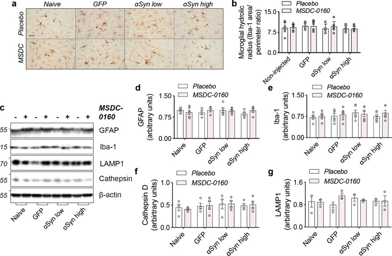 Figure 5. Absence of inflammatory or autophagy deficits in αSyn overexpressing animals. a) Overview of microglial morphology via Iba-1 staining in rat SN shows no microglial activation in αSyn overexpressing conditions. Scale bar = 50 μm. b) Quantification of microglial hydraulic radius as a measure of microglial ramification and activation (n = 8, SEM). c) Representative Western blot images of inflammatory and autophagy markers in SN. d) Iba-1 and e) GFAP markers show no signs of inflammatory activation (n = 6, SEM). d) Cathepsin-D and e) LAMP1 expression is unaltered in αSyn overexpressing animals (n = 6, SEM). Inhibiting the MPC in a mouse PFF seeding model Next, to investigate the effects of inhibiting MPC on αSyn aggregation, we examined the effects of MSDC-0160 on αSyn propagation. We used a previously established seeding model where αSyn PFFs are unilaterally injected into the OB of 12-week-old wild type mice. Over time, αSyn pathology will propagate via intraneuronal connections and cause pathology in upstream regions19,20. One-week post PFF or PBS injection into the OB, the mice were allowed free access to chow containing either MSDC-0160 or placebo (Fig. 6A). During the time of chow administration, we did not observe any differences in animal body weight or chow consumption between groups (Supplementary fig. 5A, B). At 5- and 13-weeks post-surgery, plasma was collected and the presence of hydroxymitoglitazone (MSDC-0160 metabolite) was quantified (Supplementary fig. 5C), showing detectable levels of the metabolite in treated groups.