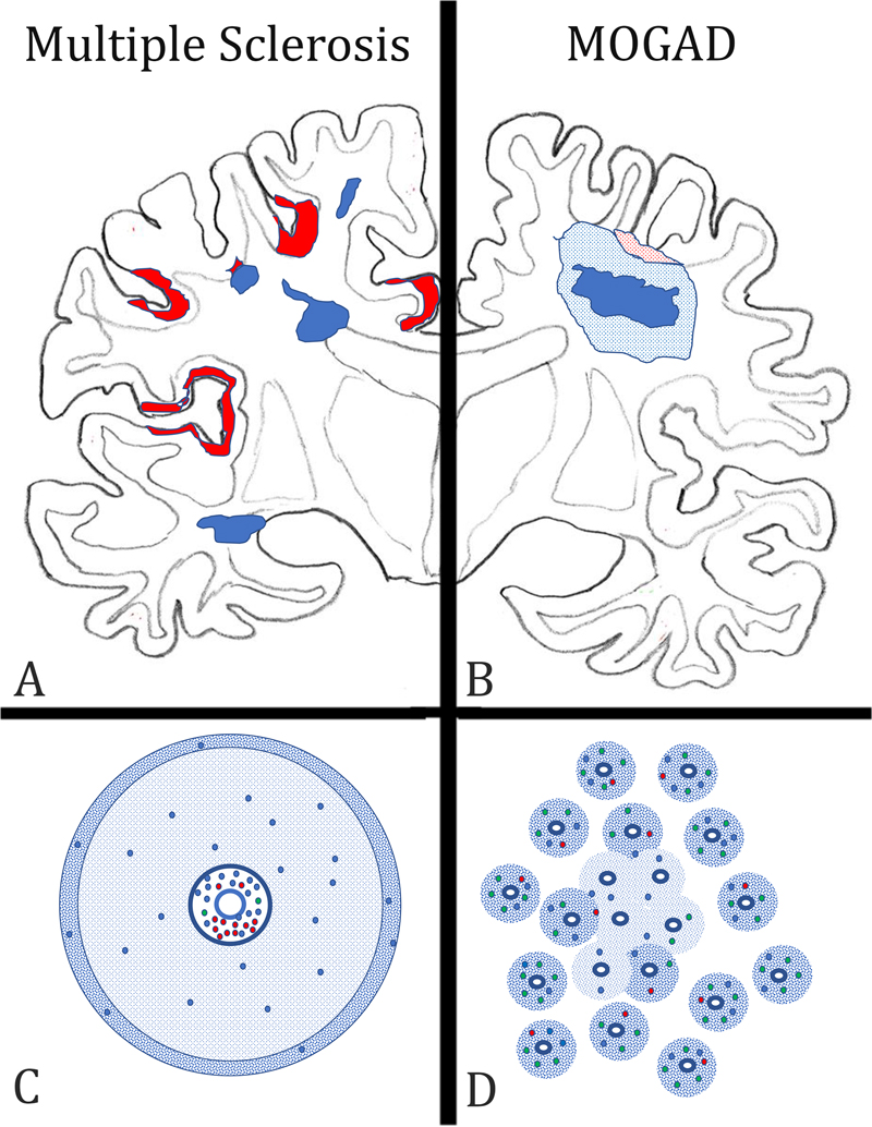 Figure 1: Key neuropathological features, distinguishing multiple sclerosis (MS) from the inflammatory demyelinating disease, which is associated with auto-antibodies against Myelin Oligodendrocyte Glycoprotein (MOGAD) in the forebrain. A) In MS, the lesions (blue areas) are located around large cerebral veins with a predilection site around the ventricle and the subcortical white matter. They are sharply demarcated from the surrounding peri-plaque white matter and frequently display finger like perivenous extensions into the deep white matter. In the cortex, band like subpial lesions (red areas) dominate, mainly located in the deep sulci of the cortical ribbon. B) In MOGAD, lesions are mainly located in the optic nerves and spinal cord, but their structural details have so far not been clearly outlined. When lesions are present in the hemispheres of the forebrain, a type of tissue injury is seen, which resembles acute disseminated encephalomyelitis. It consists of perivenous sleeves of demyelination around small veins and venules (blue dotted areas), which show confluence in the lesion center (dark blue area). When the cortex is affected small perivenous intra-cortical demyelination is seen most frequently (red dotted areas). C) In MS, the lesions form around larger veins with prominent perivascular spaces. The perivascular spaces contain mainly B-cells (red dots) and CD8+ T-lymphocytes (blue dots), the latter also disperse into the plaque parenchyma. CD4+ T-cells (green dots) are very sparse. A characteristic feature of active MS lesions is the radial expansion, reflected by a rim of activated macrophages at the lesion edge (blue dotted area). D) In contrast, in MOGAD, numerous small perivenous sheaths of demyelination are present, which arise around small veins and venules (blue dotted areas). In the inflammatory infiltrates the CD4+ T-cells dominate, while there is a much lower contribution of CD8+ T-cells (blue dots) or B-cells and plasma cells (red dots). Confluence of the perivenous lesions results in larger demyelinated plaques. Interestingly, the pathology of MOGAD closely resembles the pathology seen in experimental models of autoimmune encephalomyelitis (EAE), induced by immunization of rats, guinea pigs, or primates with CNS tissue myelin or recombinant MOG (Höftberger et al. 2020). Thus, EAE appears to be a very suitable model for MOGAD, but much less for MS. Support of this view is provided in a recent study, on archival material from a patient, who died in the 1950s with an acute MS-like inflammatory demyelinating disease after misguided repeated immunization with brain tissue (Höftberger et al. 2015). New molecular biology technologies allowed resurrection of a pathogenic auto-antibody from the archival formaldehyde fixed and paraffin embedded tissue, which was found to be directed against a conformational epitope of MOG and induced demyelination after transfer in vivo (Beltran et al. 2020). 4) Is subpial demyelination a unique feature of multiple sclerosis pathology? For a long time, MS has been regarded a demyelinating disease affecting the white matter. However, with the availability of highly sensitive immunocytochemical methods, which allow staining of the very thin myelinated fibers within the grey matter (Peterson et al. 2000), it became clear that demyelination in the grey matter in the MS brain is extensive (Kutzelnigg et al. 2005) and may even give rise to cortico-spinal or pure cortical variants of the disease in a subset of patients (Trapp et al. 2018). Three types of cortical lesions have been identified: the cortico-subcortical lesions (Type 1), the intracortical lesions (Type 2), and the subpial lesions (Type 3) (Bo et al. 2003). The third type is most abundant in MS and is related to focal inflammatory aggregates in the leptomeninges (Magliozzi et al. 2010; Figure 2). Several previous studies have indicated that subpial demyelinated lesions in the cortex may be specific for MS (Moll et al. 2008, Fischer et al. 2013), but this view was based on a rather limited sample of neuropathological conditions other than MS. This has now been changed in a very comprehensive study by Junker et al. (2020), in which nearly every thinkable neuropathological condition has been investigated for cortical demyelination. Interestingly, subpial demyelination was exclusively present in MS and not seen in any of the other conditions. The only key diagnosis missed in this case series was MOGAD. However, this was also specifically addressed in the systematic studies of MOGAD pathology outlined above (Höftberger et al. 2020, Takai et al. 2020), describing intracortical and cortico-subcortical lesions but absent subpial cortical lesions. In rare instances, these intracortical lesions can fuse and give rise to large focal confluent plaques of demyelination. Thus, so far it seems that subpial cortical demyelination is a unique feature of MS pathology, but the evidence for its absence in MOGAD is thus far based on a rather small sample of cases. Nevertheless, the presence of a subpial cortical lesion strongly supports a neuropathological diagnosis of MS.