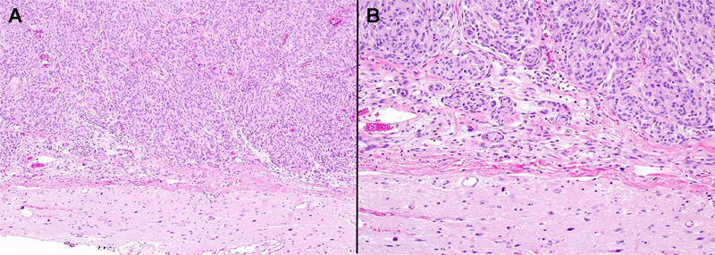 Figure 2. A, B. Most meningiomas with attached CNS parenchyma can be clearly interpreted as being non-invasive, given the broad, linear interface and clear leptomeningeal layer between the tumor and adjacent brain parenchyma. Additionally, the modified WHO 2016 criteria sparked a renewed interest in this controversy and some of the subsequent clinicopathologic series have failed to find any prognostic differences between their BIOB and non-invasive WHO grade I meningiomas9-11. In contrast, a 2016 study of 206 WHO grade II meningiomas found brain invasion to be an independent negative prognostic variable on multivariate analysis12. Another study of WHO grade II meningiomas found that brain invasion was prognostic only if specifically combined with the presence of necrosis13, even though a non-invasive meningioma with necrosis only would normally be considered as otherwise benign. For a more detailed summary of the strengths and limitations of previously published studies on this topic, the reader is referred to the review of Brokinkel, Hess, and Mawrin14. Suffice it to say that there are still no large, highly powered studies of strictly defined, gross totally resected BIOB meningiomas with long clinical followup times, given the overall rarity of such cases. As such, this question remains unanswered and the upcoming 5th edition of the WHO (in press) will include the following text on the question of brain invasion: “Brain invasion by meningioma is characterized by irregular, tongue-like protrusions of tumour cells into underlying GFAP-positive parenchyma, without intervening leptomeninges. Extension along perivascular Virchow-Robin spaces does not constitute brain invasion because the pia is not breached. Such perivascular spread and hyalinization is most commonly encountered in children and can mimic meningioangiomatosis, but does not constitute true brain invasion15,16. Brain invasion occurs most often in meningiomas with additional high-grade features. Nonetheless, the presence of brain invasion in gross totally resected, otherwise benign-appearing meningiomas remains controversial, as it has been associated with recurrence rates similar to other WHO grade 2 meningiomas in some, but not all studies5,10,11; larger series with longer follow-up times may be needed to resolve this issue.” Given the issues raised above, I decided to write this opinion piece and offer my personal views on what does or does not constitute brain invasion, recognizing that this is at best an educated guess and there is no guarantee that I am any more likely to be correct than authors with opposing viewpoints. As a reminder, most cases with brain invasion will qualify for a higher histologic grade using other criteria anyway, and cases with absolutely no other worrisome features are generally rare. Nevertheless, when encountering a BIOB meningioma on routine histopathology, it is perhaps best at this time to: 1) obtain GFAP and other immunostains (IHC) to clarify the brain invasion in borderline cases, 2) order molecular studies to look for other prognostically relevant biomarkers (e.g., specific chromosomal losses, CDKN2A homozygous deletion, TERT promoter mutation, etc.), 3) spell out the remaining uncertainties over the clinical significance of these rare cases in the pathology report, and/or 4) suggest close clinical followup just in case the tumor does behave in a more aggressive fashion.