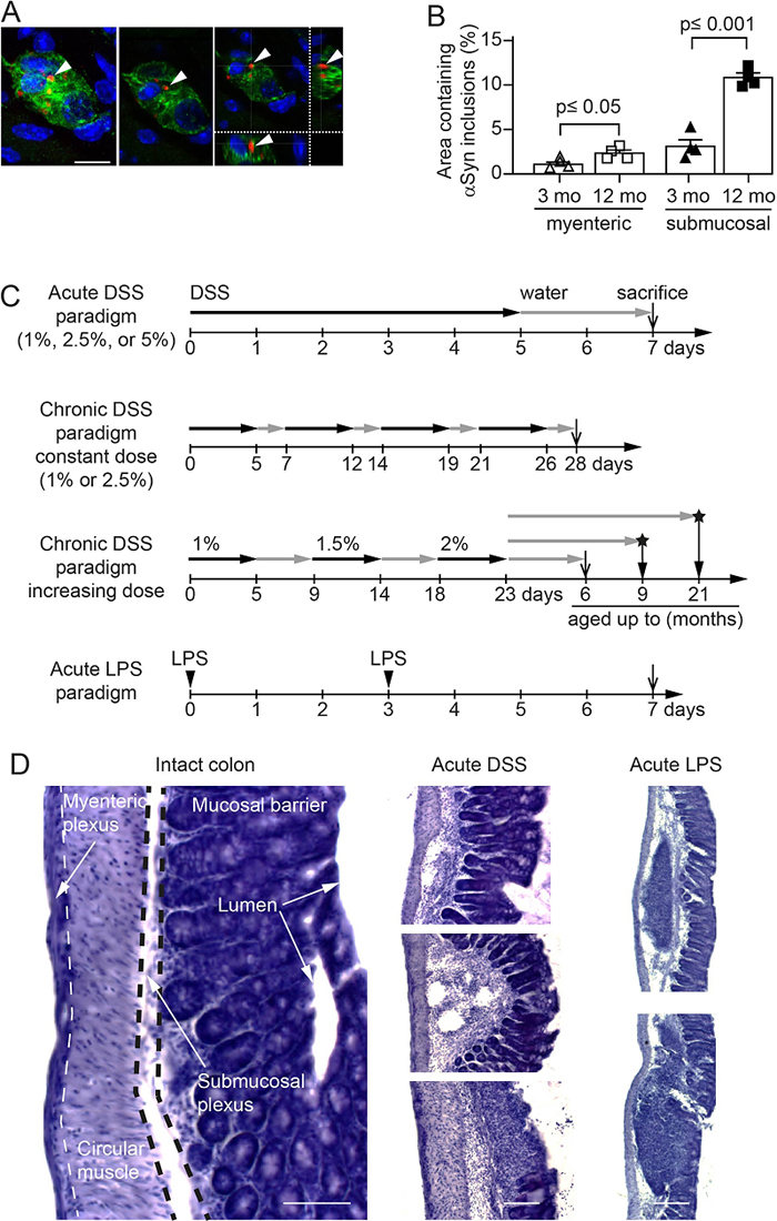 Fig. 1 Age-dependent increase of intracellular αSyn accumulation in enteric nervous system of hemizygous (Thy1)-h[A30P]αSyn transgenic mice and setup of the experimental colitis paradigms. Mice Male C57BL/6J wild type mice (Jackson Laboratories, Bar Harbor, USA), hemizygous Tg(Thy1-SNCA*A30P)18Pjk ((Thy1)-h[A30P]αSyn) [41] and Tg(Thy1-SNCA*A30P)18Pjk crossed with Cx3cr1tm1Litt ((Thy1)-h[A30P]αSyn /Cx3cr1-def; homozygous for Cx3cr1-GFP knock-in allele; [42] transgenic mice were used for the study. (Thy1)-h[A30P]αSyn transgenic mice express mutant human αSyn under the neuron selective Thy1 promoter. (Thy1)-h[A30P]αSyn transgenic mice were crossed to Cx3cr1-def transgenic mice which express eGFP replacing fractalkine receptor gene expression. All mice were maintained on a C57BL/6J background for more than 10 generations and under specific pathogen-free conditions. To the extent possible, littermates were used in the experiments. Health status was monitored daily during experiments. The in vivo experiments were endorsed by a Roche internal review board and approved by the local animal welfare authorities of the Canton Basel-Stadt, Basel, Switzerland. Experimental colitis paradigms in mice Paradigms for the induction of inflammation were either 1 week (acute) or 3-4 weeks (chronic) with or without an incubation phase under normal conditions of 2-, 6-, or 18-months post application (Fig. 1). Acute systemic inflammation was induced by intraperitoneal (i.p.) lipopolysaccharide (LPS) application [43] of 0.5 mg/kg in 100 µl injection volume on day 0 and 3 (Sigma-Aldrich Chemie GmbH, Steinheim, Germany, LPS 055:B5). Acute colitis was induced by application of 36-50kDa dextran sulfate sodium (DSS) [44] (160110, MP Biomedicals, LLC, Illkirch, France) at 1%, 2.5% or 5% in autoclaved drinking water for 5 continuous days respectively, followed by 2 days of water (1 DSS application cycle). Chronic colitis was induced by two different dosing protocols: i) in a constant dose of DSS (1% or 2.5%) for 5 days and changed to 2 days with normal drinking water and repeated three times (4 application cycles in total); ii) in an increasing dose of DSS starting at 1% for 5 days followed for 4 days on normal drinking water, then increased to 1.5% DSS for the next 5 days followed by 4 days of water and a final cycle of 2% DSS followed by aging the mice on normal drinking water until they were sacrificed. Mice from the same littermate group were randomized per cage into ‘exposed to inflammation inducing agent’ (LPS or DSS, respectively) or ‘unaffected’ (vehicle for the LPS paradigm or normal drinking water for the DSS paradigms, respectively). For the long-term experiments with the two aging cohorts ‘9 months’ and ‘21 months’, respectively, all mice in that study were simultaneously exposed in one large cohort at the age of about 3 months to the increasing dose chronic DSS paradigm (Fig. 1) and DSS exposure was stopped for all mice on the same day after the 23-day period. The mice were then kept and aged on normal drinking water and under normal housing conditions in the same room until the day they were perfused and tissue was collected. IL-10 treatment and exposure measurement Two different forms of mouse IgG bound murine IL-10 (mIgG(v1)-mIL10 and mIgG(v2)-mIL10) were diluted in pre-prepared sterile formulation buffer comprised of 0.5% mouse serum supplemented with 25 mM citrate, 300 mM arginine to a final concentration of 0.75 mg/ml and the pH adjusted to 6.7 on the day of application. Each mouse was treated once with 150 µg i.p. concurrently with the initiation of the acute colitis paradigm with 5% DSS. The concentrations of mIgG-mIL10 fusion proteins in murine serum samples were determined by enzyme-linked immunosorbent assays (ELISA) specific for the Fab moiety of the administered mIgG-mIL10 fusion protein. Biotinylated mIgG-mIL10-specific target molecules were used for capturing, goat anti-mIg IgG-HRP conjugate and peroxidase substrate ABTS were used for quantitative detection of mIgG-mIL10 fusion proteins. Immunohistochemistry Mice were injected with a lethal dose of pentobarbital (150 mg/kg). Upon full anesthesia, mice received transcardial perfusion with room temperature phosphate buffered saline (PBS). For biochemical and immunohistochemical analysis, one section of the proximal colon was either fresh frozen and stored at -80°C or post-fixed in 4% paraformaldehyde (PFA) solution for 24 h. Following post-fixation, organs were incubated in 30% sucrose/PBS at 4°C for at least 48 h before further processing. Subsequently, enteric tissue was cryotome-sectioned to 35 µm thick longitudinal sections (approx. 1 cm length). The brain was collected and post-fixed for 24 h in 4% PFA followed by 30% sucrose in phosphate buffer until cryo-sectioning of floating sections at 40 μm. Histological analysis of mouse colon was performed using standard hematoxylin staining. Immunohistochemical staining was accomplished using the Vectastain Elite ABC Kits and Peroxidase Substrate Kit SK-4100 (Vector Laboratories, Burlingame, CA, USA) or fluorescently labelled secondary antibodies (Alexa 488, 555 or 647, Life Technologies, Zug, Switzerland). The following primary antibodies have been used for overnight incubation at a dilution of 1:1000; monoclonal antibody to human αSyn (clone 211, sc-12767, Santa Cruz Biotechnology, Heidelberg, Germany; specific to human αSyn and binds to normal αSyn as well as abnormal αSyn inclusions which contain the respective epitope), monoclonal antibody generated towards rat αSyn, cross-reactive with murine and human αSyn (Syn1/clone 42, BD Transduction Laboratories, Allschwil, Switzerland; used for wild type mice), polyclonal antibody to the peripheral neuronal marker Peripherin (Millipore Corporation, Billerica, MA, USA), and polyclonal antibody to macrophage marker Iba-1 (Wako Chemical GmbH, Neuss, Germany). To detect αSyn phosphorylated at Serine 129 (pSer129-positiv