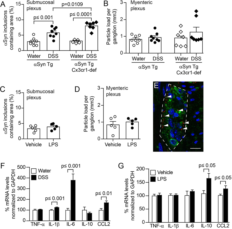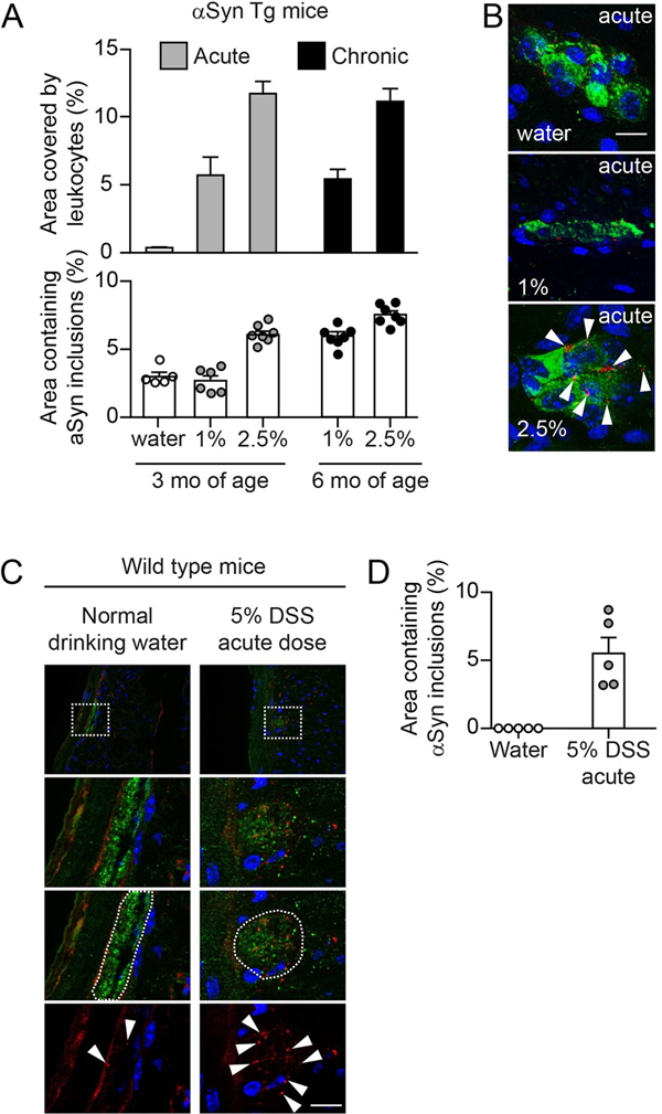 Fig. 2 Experimental DSS colitis severity and duration-dependent aggravation of accumulation of αSyn inclusions in the colonic submucosal plexus of hemizygous (Thy1)-h[A30P]αSyn transgenic and wild type mice. Wild type mice also express endogenous αSyn in innervated organs, but at much lower levels compared with the levels of human αSyn expressed by the hemizygous (Thy1)-h[A30P]αSyn transgenic mice (Suppl. Fig. 1). To confirm that the finding in (Thy1)-h[A30P]αSyn transgenic mice was independent of transgenic expression of human αSyn, we applied an acute 5% DSS dose paradigm (5 days DSS + 2 days water) in wild type mice (Fig. 1C). We observed, in the submucosal plexus, small inclusion bodies of endogenous murine αSyn (detected by rodent cross-reactive αSyn-specific monoclonal antibody Syn1/clone 42, Fig. 2C, D). These features were close to undetectable in the water group that did not experience experimental colitis. A separate experiment also confirmed that the observed effects of elevated αSyn inclusions following acute DSS (5% dose) could not be attributed to increased gene expression of murine or the transgenic human αSyn (Suppl. Fig. 3). Together, these results confirmed the validity of this experimental IBD paradigm to test the effect of inflammation on αSyn accumulation in the ENS in wild type and (Thy1)-h[A30P]αSyn transgenic mice. Because the (Thy1)-h[A30P]αSyn transgenic mouse model is well-established to analyze human αSyn-related pathology, we focused for the remainder of the study on employing these transgenic mice. Colitis induced by peroral DSS but not by intraperitoneal administration of LPS aggravates αSyn accumulation in colonic submucosal plexus of αSyn transgenic mice Different inflammatory agents induce different types of immune stimulation and thus can influence the phenotype of experimental colitis. A well-established experimental immune trigger is the bacterial endotoxin LPS. In order to explore the effects of different approaches to induce inflammation in or nearby the gut in (Thy1)-h[A30P]αSyn transgenic mice, we compared the outcome of acute (5 days DSS + 2 days normal drinking water) 5% DSS per os with acute 0.5 mg/kg intraperitoneal LPS administration (Fig. 1C and 3). To maximize the inflammatory response, we administered both DSS and LPS at relatively high doses. At day 7, both agents had induced variable degrees of leukocyte infiltration in the submucosa of the colon while a marked destruction of the mucosa was induced when giving only DSS (Fig. 1D). As before, the DSS-exposed mice presented with increased accumulation of αSyn in the ganglia of the submucosal plexus (Fig. 3A). In contrast, we detected no change in αSyn load in the myenteric plexus, consistent with lack of leukocyte infiltration in this part of the colonic wall (Fig. 3B). Despite the high dose, LPS-induced inflammation did not increase αSyn accumulation in the colonic nervous plexuses (Fig. 3C, D). Notably, LPS and DSS resulted in a differential expression of cytokines, and consistent with leukocyte recruitment, CCL2 was elevated in both (Fig. 3F, G). In the LPS paradigm, mRNA for IL-10 was markedly elevated, whereas DSS strongly increased IL-6 and also IL-1β but not IL-10. Together these results indicate that, in our model, colonic inflammation induced by peroral DSS but not intraperitoneal LPS increases the accumulation of αSyn in the colon.