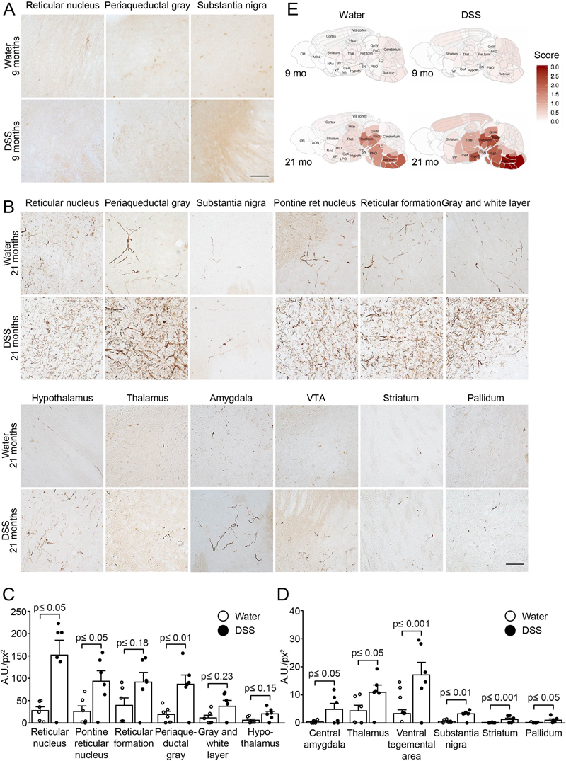 Fig. 5 A 23-days chronic DSS colitis insult at young age causes an age-dependent accumulation of proteinase K-resistant pSer129-αSyn in various brain regions of (Thy1)-h[A30P]αSyn transgenic mice. A 23-days chronic increasing dose DSS paradigm was performed with 3-month-old (Thy1)-h[A30P]αSyn transgenic mice. After recovering and further aging, various brain regions were analyzed for proteinase K (PK)-resistant pSer129-αSyn immunoreactivity in 9-month (A) and 21-month-old (B) mice, respectively. The dark brown features in (A) (barely any visible in both the water and the DSS group) and (B) (strongly visible with typical neuritic and punctated inclusion-type morphology) indicate PK-resistant inclusions with pSer129-αSyn immunoreactivity. Densitometric quantification of pSer129-αSyn immunoreactivity in different brain regions of 21-month-old mice (C, D) (n=6 mice per group). In order to visualize better the differences between the water versus the DSS group at 21 months, brain regions with large increase were plotted on an y-axis up to 250 A.U./px2 and small increase on a y-axis up to 40 A.U./px2. The about <5 to 150 A.U./px2 average values in the DSS group versus the about 0 to 30 A.U./px2 average values in the water group in several brain regions confirm the visual impression in panel (B). One 21-month-old mouse in the DSS group was excluded from analysis due to presumed failed treatment; it is included in the graphs. Statistical analyses were performed using negative-binomial mixed-effects models adjusting for multiple comparisons. E Representative heatmap of the average distribution scores of pSer129-αSyn immunoreactivity for each treatment group in varying brain regions in all the 9-month (A and Supplemental Figure 5) and 21-month-old (B) mice was generated in a sagittal mouse brain (n=10 mice per group). Statistical analyses were performed using linear mixed-effects model adjusting for multiple comparisons. A.U./px2, = mean grey value x area stained/total area assessed. Scale bars: 500 μm. Discussion Currently, there is no therapy for PD available to slow or stop disease progression and an obstacle in the quest to develop one is that we do not understand how the disease develops [58]. Abnormal intraneuronal accumulation of αSyn (i.e., in Lewy bodies and neurites) is a key neuropathological hallmark and the distribution of Lewy pathology in postmortem brain is used for staging in PD [2,59]. Accumulation of αSyn has also been observed in the peripheral nervous system in PD, some individuals at risk of developing the disease, and normal individuals [60–62]. Similar to this finding in humans, αSyn-immunoreactive inclusions and signs of age-dependent αSyn-related pathological changes have also been detected in the ENS of wild type rats [63,64] and several transgenic mouse models prior to development of brain pathology [21,65]. Based on preclinical models employing injection of brain extracts or re-combinant αSyn fibrils to different brain regions and intestines [15–17,19,20,46,66,67] together with postmortem brain pathology [56,59,68], it has also been suggested that αSyn pathology propagates temporospatially from cell-to-cell in a prion-like manner [3,59,66,68,69]. However, the initial factors triggering αSyn aggregation in the tissue or organ of origin of the pathology are yet to be established [58] and the involvement of peripheral stimuli in the aggregation and pathogenic spread of αSyn is only beginning to unravel. In this study, we provide evidence that DSS colitis, i.e., an experimental IBD-like inflammation, triggers αSyn accumulation in the ENS of wild type mice and in a human αSyn transgenic mouse model of PD (Fig. 2). We found aggravation of enteric αSyn accumulation in αSyn transgenic mice lacking Cx3cr1 signaling and amelioration of inflammation and associated slight reduction of enteric αSyn load by systemic IL-10, demonstrating that genetic and pharmacologic modulation of inflammation can influence the degree of αSyn accumulation in the ENS (Fig. 3 and 4). Because IL-10 and the CX3CR1-CX3CL1 axis are able to mediate this effect, this suggests that monocytes/macrophages may modulate the process in this model. We further observed that the aggravated αSyn accumulation in the ENS persisted even after two months of recovery from DSS colitis and was aggravated in the absence of CX3CR1 signaling. This indicates that the accumulation is persistent and this further establishes that monocytes/macrophages play a critical role in this process (Suppl. Fig. 4). Remarkably, at 18 months but not 6 months post induction of DSS colitis (thus, at age 21 months but not 9 months, respectively), αSyn transgenic mice had developed massively elevated αSyn brain pathology (Fig. 5 and Suppl. Fig. 5). This elevated PK-resistant pSer129-αSyn pathology in the midbrain, including the substantia nigra, and other brain regions coincided with an average decrease of 30-50% of TH- and Nissl-positive cells in the nigra (Fig. 6). We chose to perform the long-term experiments in αSyn transgenic mice rather than wild type mice while being aware of the caveats of employing genetic overexpression models, which use a neuron selective Thy-1 promoter cassette such as these (Thy1)-h[A30P]αSyn transgenic mice. However, these particular αSyn transgenic mice had previously been shown to slowly develop αSyn pathology in the brain on a homozygous genotype [41,57] making them ideal when asking the question of whether transient colonic inflammation can aggravate brain pathology in a genetically predisposed animal such as the hemizygous transgenic mice used in this study. Others have recently demonstrated in a more aggressive αSyn transgenic mouse model that mild DSS colitis can accelerate αSyn accumulation in the ENS and brain [38]. In future long-term studies, we plan to address whether αSyn pathology develops also in the brains of wild type mice if they sustain transient experimental IB