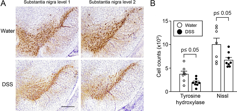 Fig. 6 A 23-days chronic DSS colitis insult at young age results in loss of tyrosine hydroxylase- and Nissl-positive cells in the substantia nigra of (Thy1)-h[A30P]αSyn transgenic mice at 21 months of age. We established that a mechanism by which a specific type of peripheral inflammation promotes αSyn accumulation in the colon potentially involves monocytes and macrophages. Both peroral DSS and intraperitoneal LPS administration provoked strong local immune reactions resulting in leukocyte infiltration into the submucosa of the colon. The inflamed region of the colon contains the submucosal plexus and is anatomically separated from the myenteric plexus by a thick circular muscle (Fig. 1). This discrete localization of inflammation to the submucosa might explain why αSyn only accumulated in the nerves of the submucosal plexus and not in the myenteric plexus of our mice that received DSS in both a strong acute and the two chronic paradigms. The mechanism underlying how intraperitoneally administered LPS leads to submucosal leukocyte infiltration likely involves the monocyte attractant chemokine CCL2 (Fig. 3), but the specifics remain to be clarified [70]. Indeed, CCL2 was also upregulated in the colon of our DSS model. However, in contrast to intraperitoneal LPS, where infiltrating macrophages were present in discrete patches in the colonic wall, DSS-related macrophage infiltration was distributed both in small groups and larger randomly distributed patches of cells across the entire colonic submucosa. Also, perorally administered DSS destroys the mucosa of the colon, similar to some forms of ulcerative colitis, resulting in the transient disintegration of the intestinal epithelial barrier. In our (Thy1)-h[A30P]αSyn transgenic mice, the subsequent immune response to the infiltration of commensal bacteria evoked an elevated expression of cytokines such as IL-1β and IL-6, a phenomenon also observed in the colon of IBD patients [71,72]. This upregulation was absent in the LPS paradigm in which the intestinal mucosa remained intact. By acting on tight junctions, IL-1β and IL-6 can increase intestinal barrier permeability (gut leakiness), facilitating the recruitment of additional immune cells to the site of the inflammation, eventually culminating in widespread immune activation [73,74]. Consistent with the breach of barrier permeability in our mouse model, some PD patients exhibit increased colonic cytokines such as IL-1β, IL-6 and TNF, occurring together with increased intestinal permeability [23,75]. In this context, it is also notable that people with Crohn’s disease present with increased enteric αSyn expression [55] and even more striking that IBD patients on anti-TNF therapy have a reduced risk of developing PD compared to IBD patients not given this treatment [35]. Notably, mucosal macrophages with intra-lysosomal αSyn content were previously described in the intact human appendix [76]. These macrophages were in close proximity to the axonal varicosities of the vermiform appendix, which showed an enriched staining for αSyn in the mucosal plexus. Furthermore, we recently found that the vermiform appendix contains aggregated and truncated αSyn that has the propensity to seed aggregation of recombinant αSyn in vitro [62]. Our finding of LPS not being able to induce an αSyn phenotype in the colon is in contrast to the reports by Kelly and colleagues who injected wild type mice with LPS and observed an immediate and progressive increase in αSyn immunoreactivity in the myenteric ganglia of the large intestine but not in the small intestine [77]. The low dose (0.5 mg/kg used in our study versus 2.5 mg/kg used by Kelly and colleagues), coupled with the possible usage of different bacterial strains to generate LPS affecting potency and pyrogenicity of LPS (here strain O55:B5 was administered versus presumably strain O111:B4 used by Kelly and colleagues and others [78], and potential effects of different environments and microbiomes [79] may contribute to this discrepancy. It will be interesting to study the mentioned parameters and their role in inducing αSyn pathology further in rodent models and explore how this could be translated to the even more heterogeneous human setting. Similarly, others showed that employing a sub-chronic 0.5% DSS paradigm for 3 weeks in wild type mice did not trigger an αSyn pathology in the colon [80]. While we have not tested this particular sub-chronic DSS colitis paradigm and instead had administered 5% DSS acutely to the wild type mice (Fig. 2C), the data by Garrido-Gil and colleagues may corroborate our results which show in αSyn transgenic mice that a certain DSS dose and severity of inflammation is required in order to induce accumulation of αSyn in the submucosal plexus (Fig. 2A). What could be a functional role of the αSyn species found in abundance in the gut wall? Monomeric and oligomeric αSyn species reportedly act as chemoattractants for neutrophils and monocytes, enhancing the maturation of dendritic cells in the ENS [22,81]. With such a role in intestinal immunity, it is possible that the tissue destruction induced by DSS in the present study led to release of αSyn, which perhaps served as a chemoattractant for monocytes. The increased abundance of αSyn and altered intestinal permeability, along with the DSS-evoked inflammatory response may have provided an enabling milieu allowing further αSyn accumulation in the ENS of the colon [77]. Macrophages and other immune cells are also regulated by several genes including LRRK2, an established risk gene for PD and IBD. It will be interesting to explore how mutations in genes that control autophagy, including the LRRK2 gene, influence the handling of αSyn by macrophages that invade the inflamed colon in our DSS colitis paradigm. Despite the intriguing translational aspect of our finding in the DSS paradigm, others have very recently reported that DSS colitis in mice down-regulates 