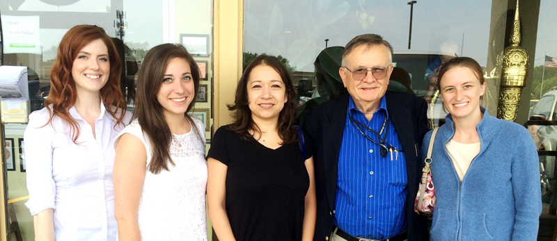 Figure 1. Laboratory staff in Albany, NY. From left to right: Alyssa Sossei, research assistant; Sarah Bjork, medical student; R. Liane Ramirez, research assistant; the author; Pamela Kruger, post-doctoral scientist. A new goal: the hereditary ataxias In 1972, a patient with autosomal dominant ataxia presented with an unusual disturbance of ocular motility that became known as supranuclear pseudoophthalmoplegia. Many years later, the mutation was identified as a cytosine-adenine-guanine (CAG) trinucleotide repeat expansion on chromosome 12, and the disease was named spinocerebellar ataxia type 2 (SCA-2). The mutation was like the CAG trinucleotide expansions in SCA-1 and SCA-3 (Machado-Joseph disease). SCA-6, SCA-7, and SCA-17 were later also identified as the consequence of CAG trinucleotide repeat expansions. The expansions are expressed by changing the length of polyglutamine in the cognate proteins, hence, became known as polyglutamine (or polyQ) diseases. Antibodies raised against the polyQ stretch of the normal TATA-binding protein, designated “1C2”, became useful in the visualization of intranuclear inclusion bodies in the ataxic polyQ diseases and Huntington's chorea. Stimulated by the experience with a single patient with supranuclear pseudoophthalmoplegia, I traveled to Scotland, his ancestral home, to search for other members of this family. Over a period of 40 days, I could not find any but discovered unrelated patients with an identical disturbance of eye movements. At that time, commercial genetic testing for SCA was not yet fully available, and the lack of saccades in some patients with ataxia became a "genetic marker" of the disease. The discovery of supranuclear pseudoophthalmoplegia remains important but due to its variability can no longer be called a genetic marker. The Scottish experience (Koeppen, et al, 1977) prompted me to apply to the Alexander-von-Humboldt Foundation for a research fellowship. The Foundation agreed, and I moved to the University of Hamburg, Germany, where I found a warm welcome in the Department of Human Genetics and the neuropathological institute of the Eppendorf University Hospital. The plan was to backtrack from autopsy records to surviving family members. The director of Eppendorf neuropathology was Prof. Hans-Joachim Colmant, a psychiatrist. He made available a huge archive of neuropathological specimens in the basement of the hospital that had survived the bombings of World War II. The chief psychiatrist during the war, Prof. Hans Bürger-Prinz, decided that the collection of slides, reaching back to 1891, should be protected against the Allied bombings and moved the collection to a secure location. Beyond specimens of ataxia, the collection also contained invaluable other cases, including Jakob's original 1920 specimens of prion disease. It was an exciting experience to study these slides and be allowed to make photographs. German neuropathologists favored Cresyl violet as their routine stain, and it was apparent that this stain does not properly show the sponginess that is readily apparent on hematoxylin-and-eosin. My stay in Hamburg was intermittent, but I benefitted from the collection at the Eppendorf Hospital over an aggregate period of 2 years. On return to Albany, NY, I began to collect autopsy specimens of hereditary ataxia in a tissue repository and, to this day, make available fixed and frozen samples to other ataxia investigators.