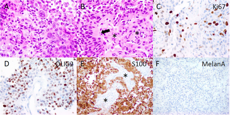 Figure 2. Histopathology. The tumor included more pleomorphic regions (A), as well as neoplastic cells with thick, short processes (arrow, B) arrayed around proliferating blood vessels (asterisks, B). The tumor was quite proliferative on Ki67 immunostain (C), and diffusely positive for OLIG2 (D) and S100 (E), while blood vessels did not express these glial markers (asterisks, E). MelanA was not expressed in the tumor (F). (Original magnifications: A-E 400X, F 200X). Molecular Diagnostics Next-generation sequencing (NGS) found a tumor mutation rate of 0.88 mutations per megabase, no known pathologic variants, and several variants of unknown significance, including ADGRA2 (p.G407S), AR (p.A646D), BLM (p.R643H), EPHA5 (p.L907V), and PRKDC (p.I1013V), all with allele frequencies of 46% or higher. No alterations in TP53, ATRX, BRAF, H3F3A or HIST1H3B were detected on NGS. DNA methylation profiling was consistent with a “high-grade neuroepithelial tumor with MN1 alteration”, with a calibrated score of 0.994 (Fig.3A). Copy number evaluation using data from the methylation array demonstrated alterations in chromosome 22 and X (Fig.3B). Subsequent gene fusion testing found a Ewing Sarcoma breakpoint region 1/EWS RNA binding protein 1 (EWSR1) - BEN Domain Containing 2 (BEND2) fusion between loci on chromosomes 22 and X (Fig.3C). The integrated diagnosis was malignant neoplasm consistent with astroblastoma with MN1 alteration.