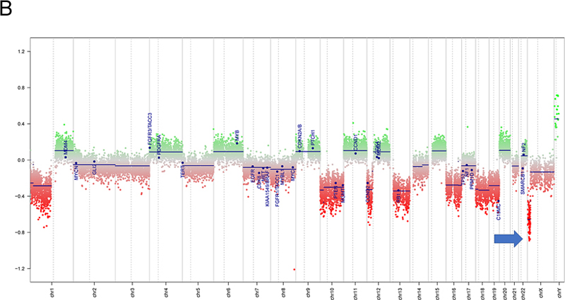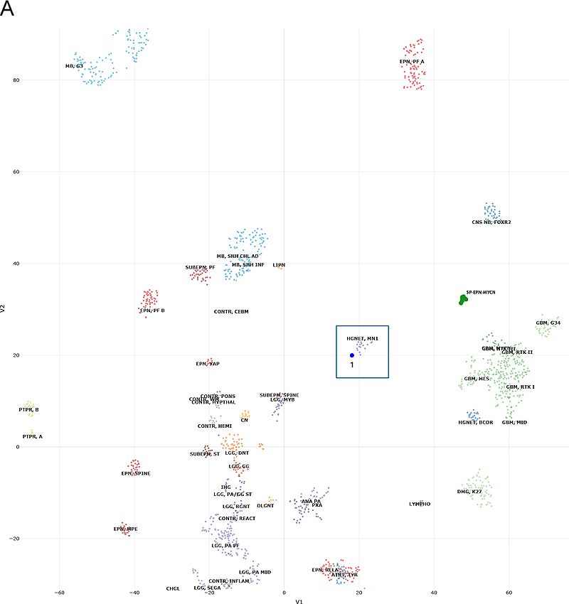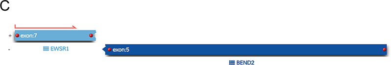 Figure 3. Methylation and copy number profiling of astroblastoma with an EWSR1-BEND2 fusion. (A) The lesion (blue box) was plotted on an X–Y coordinate graph (red dot to the lower left of the x–y intersection), where closer proximity to other dots indicates greater similarity of the index tumor’s genomic CpG methylation pattern to existing cases in the library. (B) Copy number profiling demonstrates the location for EWSR1-BEND2 fusion at chromosome 22 and X (blue arrow). (C) Fusion between exon 7 of EWSR1 and exon 5 of BEND2 genes with breakpoints at genomics positions chr22:29683123 and chrX:18234853 respectively. The red arrow represents the direction of the gene specific primary utilized by the Archer assay to enrich the amplicons for EWSR1 fusion events. Legend: MB,G3, medulloblastoma, subclass group 3; EPN, PF A, ependymoma, posterior fossa group A; EPN, PF B, ependymoma, posterior fossa group B; SUBEPN, PF, subependymoma, posterior fossa; MB, SHH CHL AD, medulloblastoma, subclass SHH A (children and adult); MB, SHH INF, medulloblastoma, subclass SHH B (infant); CONTR, CEBM, control tissue, cerebellar hemisphere; LIPN, cerebellar liponeurocytoma; CNS NB, FOXR2, CNS neuroblastoma with FOXR2 activation; SP-EPN-MYCN, MYCN amplified spinal cord ependymoma; EPN, YAP, ependymoma, YAP fusion; HGNET, MN1; high grade neuroepithelial tumor with MN1 alteration; GBM, G34, glioblastoma, IDH wildtype, H3.3 G34 mutant; GBM, MES, glioblastoma, IDH wildtype, subclass mesenchymal; GBM, MID, glioblastoma, IDH wildtype, subclass midline; GBM, MYCN, glioblastoma, IDH wildtype, subclass MYCN; GBM, RTK I, glioblastoma, IDH wildtype, subclass RTK I; GBM, RTK II, glioblastoma, IDH wildtype, subclass RTK II; GBM, RTK III, glioblastoma, IDH wildtype, subclass RTK III; HGNET, BCOR, CNS high grade neuroepithelial tumor with BCOR alteration; PTPR, A, papillary tumor of the pineal region group A; PTPR, B, papillary tumor of the pineal region group B; CONTR, PONS, control tissue, pons; CONTR, WM, control tissue, white matter; CONTR, HYPTHAL, control tissue, hypothalamus; CONTR, HEMI, control tissue, hemispheric cortex; CN, central neurocytoma; SUBEPN, SPINE, subependymoma, spinal; LGG, MYB, low grade glioma, MYB/MYBL1; LGG, DNT, low grade glioma, dysembryoplastic neuroepithelial tumor; LGG, GG, low grade glioma, ganglioglioma; IHG, infantile hemispheric glioma; LGG, PA/GG ST, low grade glioma, rosette forming glioneuronal tumor; LGG, RGNT, rosette forming glioneuronal tumor; CONTR, REACT, reactive tumor microenvironment; DLGNT, diffuse leptomeningeal glioneuronal tumor; ANA PA, anaplastic pilocytic astrocytoma; PXA, (anaplastic) pleomorphic xanthoastrocytoma; LYMPHO, lymphoma; DMG, K27, diffuse midline glioma H3 K27M mutant; LGG, PA PF, subclass posterior fossa pilocytic astrocytoma; LGG, PA MID, midline pilocytic astrocytoma; CONTR, INFLAM, control tissue, inflammatory tumor microenvironment; EPN, RELA, ependymoma, RELA fusion; ATRT, TYR, atypical teratoid/rhabdoid tumor, subclass TYR; CHGL, chordoid glioma of the third ventricle; LGG, SEGA, subependymal giant cell astrocytoma. Subsequent Clinical Course The patient was treated with fractionated radiation (5040 cGy in 28 fractions) with concurrent daily temozolomide (75 mg/m2) followed by adjuvant temozolomide (150-200 mg/m2, 5 days-on/23 days-off) with a partial response. At the time of writing, the patient has not progressed since initiation of treatment over one year ago. Clinically the patient was able to return to work full time with continued central neuropathic pain of the left face and right-side extremities and trunk managed with gabapentin. Discussion Astroblastoma has historically been a controversial entity since its introduction in the 1924 classification of CNS brain neoplasms by Cushing and Bailey.1 MN1-altered astroblastomas arise primarily in cerebral locations in pediatric patients and young adults.2 In addition to the presence of a EWSR1-BEND2 fusion, our case is unusual compared to other described MN1-altered astroblastoma in that the patient is near his fourth decade of life and with tumor located in the brainstem and upper cervical spine, rather than the cerebrum. Including the case presented, there are three other described cases of CNS tumors with a EWSR1-BEND2 fusion (Tab. 1).3–5 Aside from one case that did not provide additional information, these tumors occurred in males and were infratentorial, involving the spinal cord and sometimes the brainstem.3–5 Although non-specific, MRI of astroblastomas have been described to enhance, as well as appear well-demarcated, cystic, and lobulated, which is consistent with our case and similar to other cases of EWSR1-BEND2 fused astroblastoma tumors (Fig.1).3,4,6 Comparable to conventional MN1-altered astroblastomas and other cases of EWSR1-BEND2 fused tumors, our case showed perivascular growth and immunohistochemistry was positive for S100, OLIG2, EMA and GFAP.2–4 Ultrastructural observations in astroblastomas suggest a relationship to tanycytes, an ependymal cell subtype, but it is unclear if this applies also to MN1-altered and EWSR1-BEND2 fused astroblastomas.1,2 Molecular profiling has had a huge impact on the diagnosis of “astroblastic” tumors and has helped clarify subtypes of astroblastoma. In 2016, Sturm et al. identified a group of 41 tumors with a common methylation profile and MN1 fusions, designating them ‘CNS high-grade neuroepithelial tumor with MN1 alteration’ (CNS-HGNET-MN1).7 Notably, the majority of these contained astroblastic or ependymal perivascular pseudorosettes, although a number of other histopathological appearances were also represented. Subsequent studies of MN1-altered brain tumors have confirmed that many, but not all, have ependymal or astroblastic features.8 Based on these and other studies, the Consortium to Inform Molecular and Practical Approaches to CNS Tumor Taxonomy (cIMPACT-NOW) has proposed designating these tumors “astroblastoma, MN1-